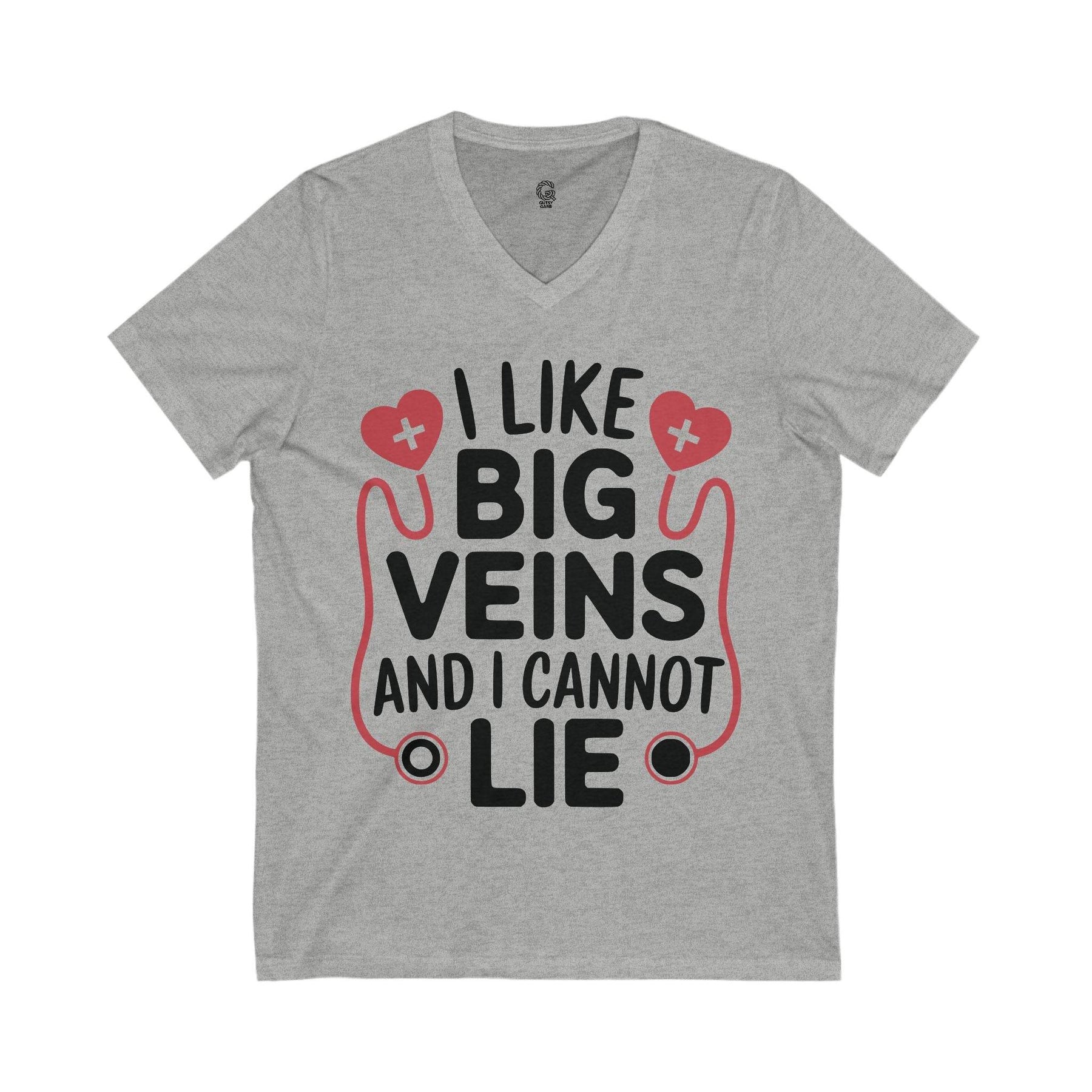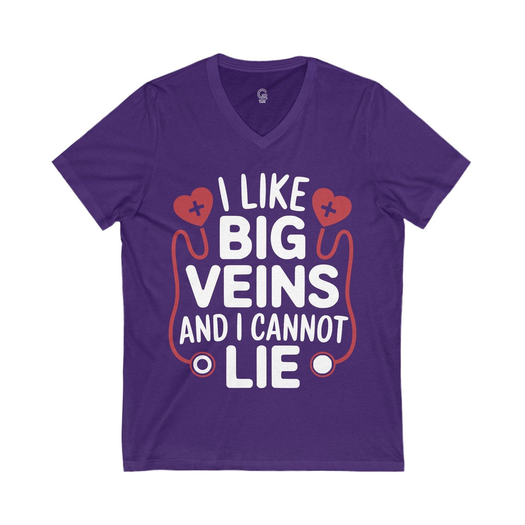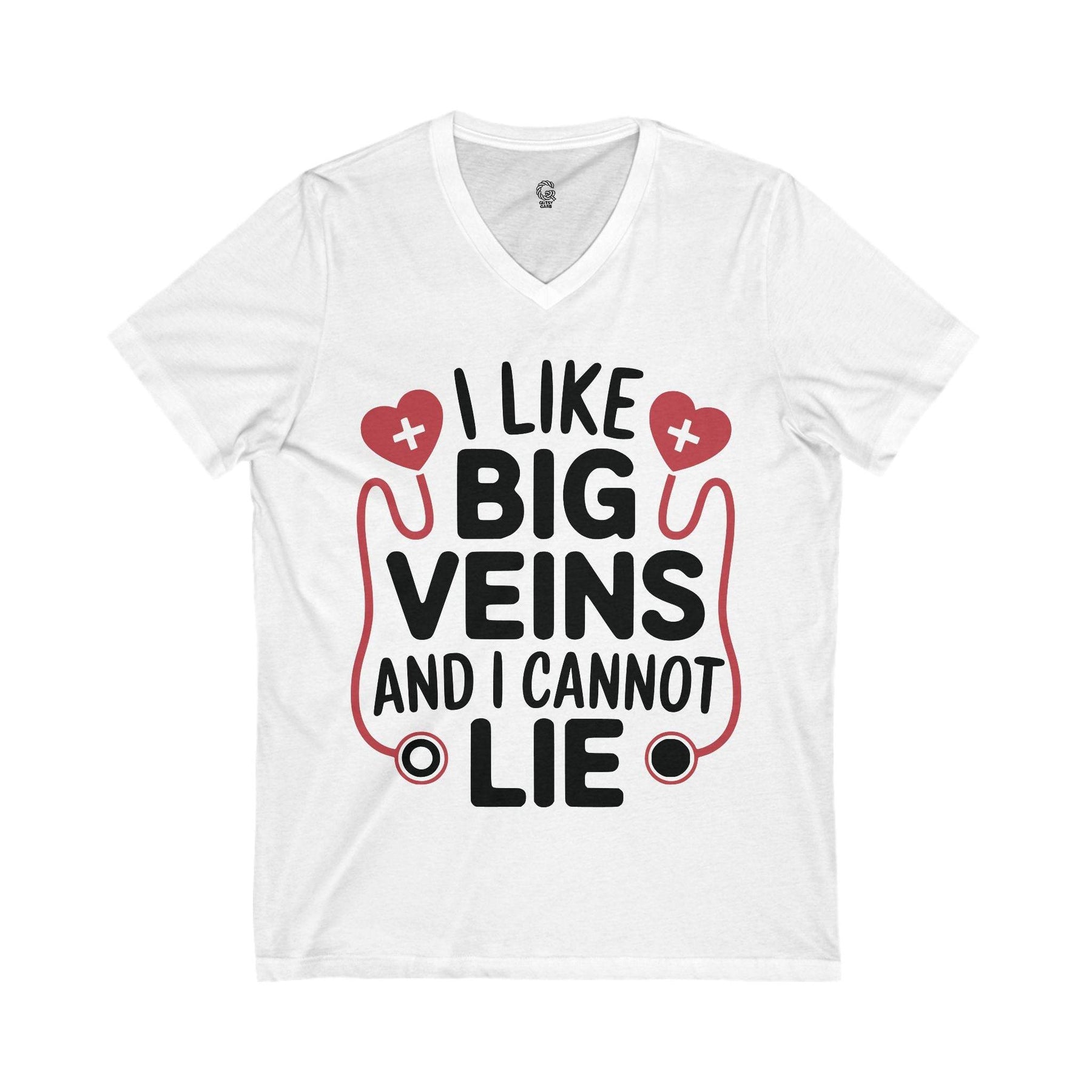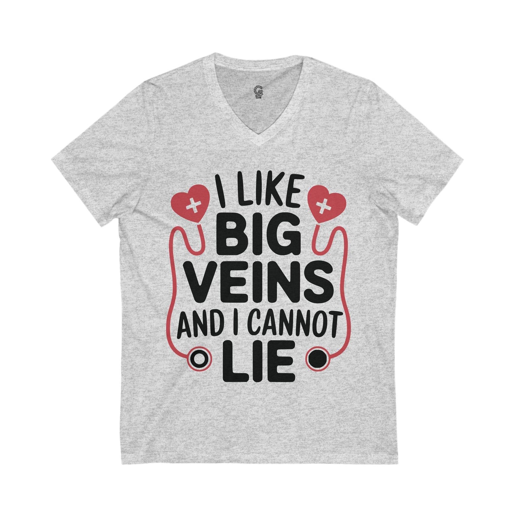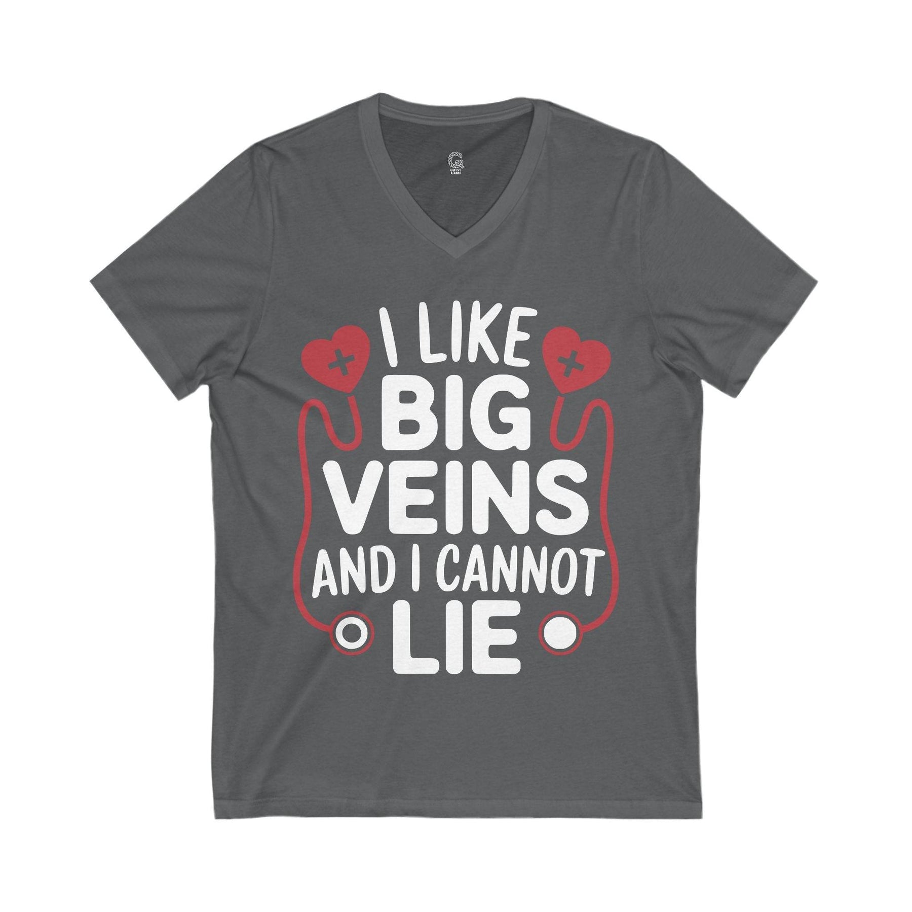 Show off your sense of humor and style with the Big Veins Fan Women's Graphic Tee. This v-neck is perfect for anyone looking for a nurse appreciation shirt funny enough to make coworkers smile. The bold text reads "I Like Big Veins And I Cannot Lie," making it stand out in any department.
