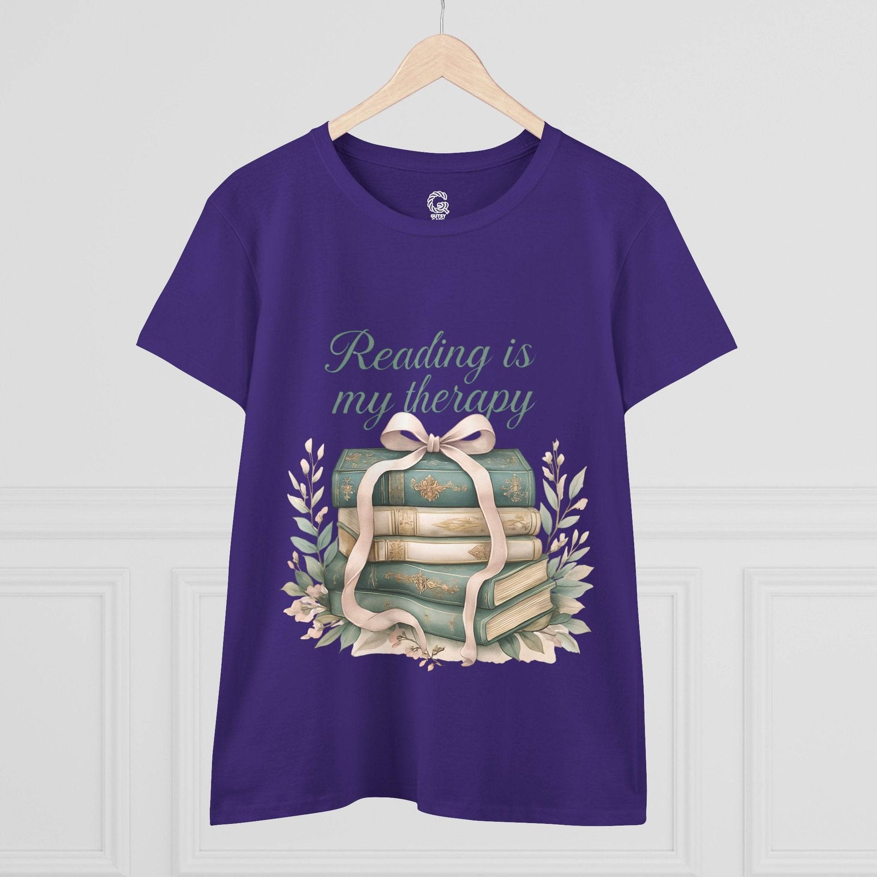 A stack of elegant books decorates the chest. The script spells out “reading is my therapy.” This gives the reading is my therapy shirt a charming touch. Each detail adds to the peaceful, book-lover style.