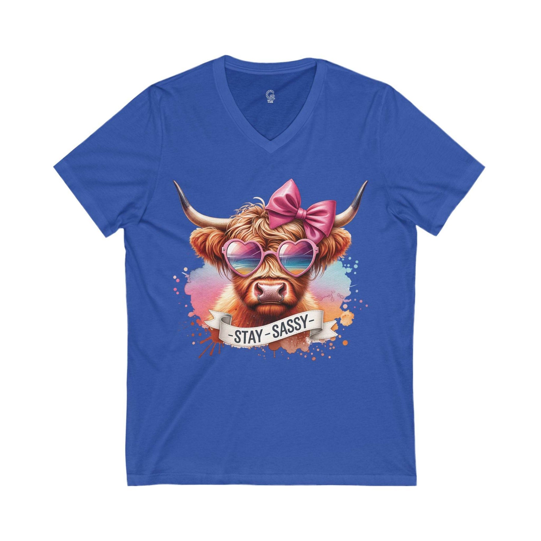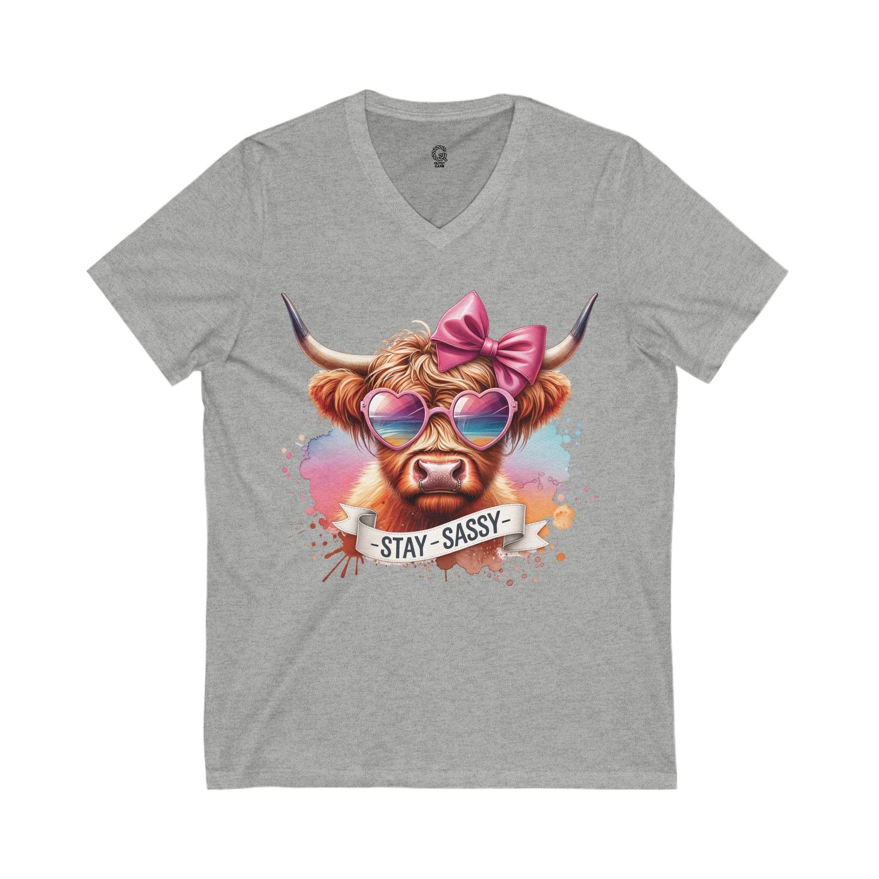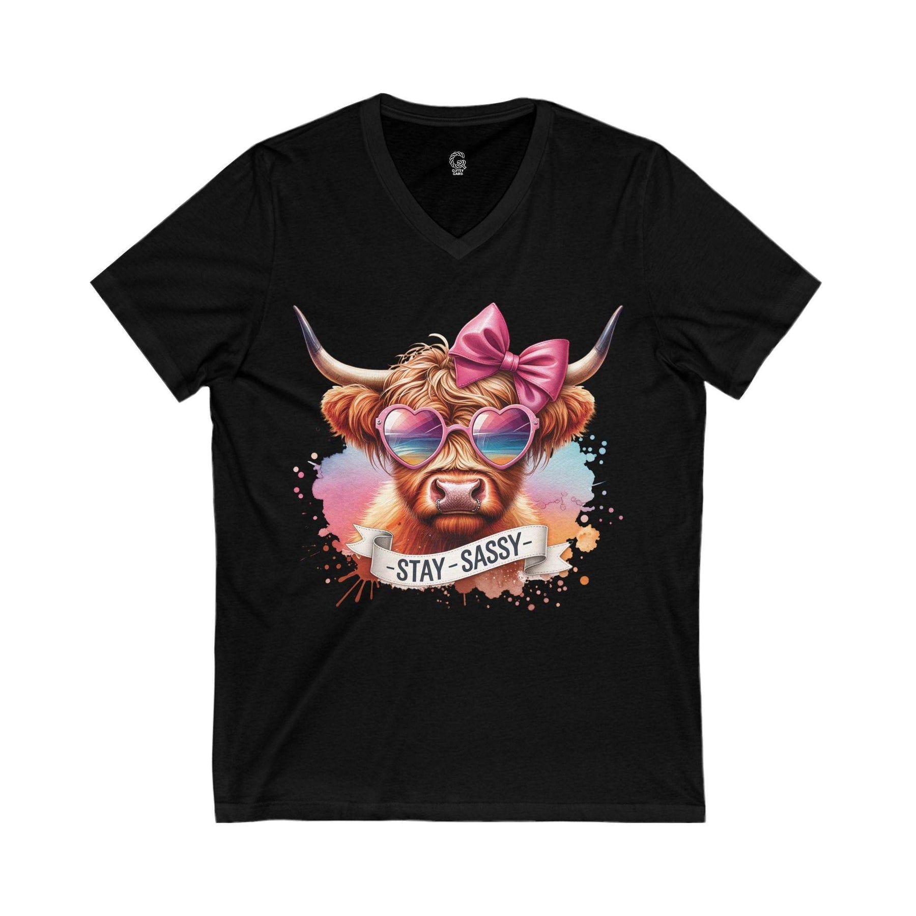 Bring a bold touch to your wardrobe with the Sassy Highland Cow V-Neck Tee from Gutsy Garb. This eye-catching shirt stands out with a fun, colorful highland cow graphic on the front. The design features heart sunglasses and a pink bow, making it perfect for showing off your playful spirit. This sassy animal lover shirt is easy to style with jeans, shorts, or your favorite pair of leggings. The soft fabric feels comfortable for day-long wear, whether you're running errands or relaxing at home.