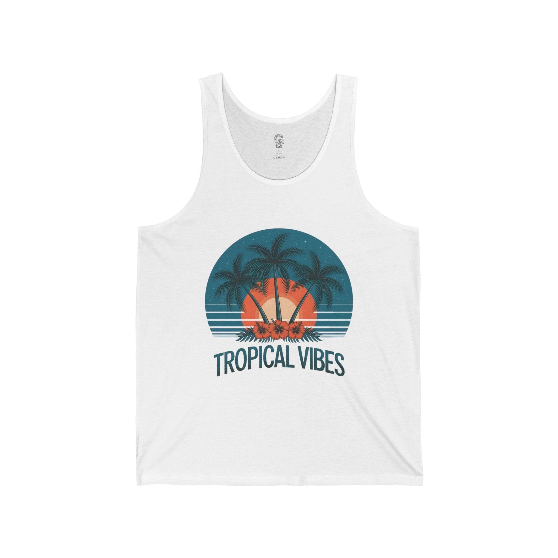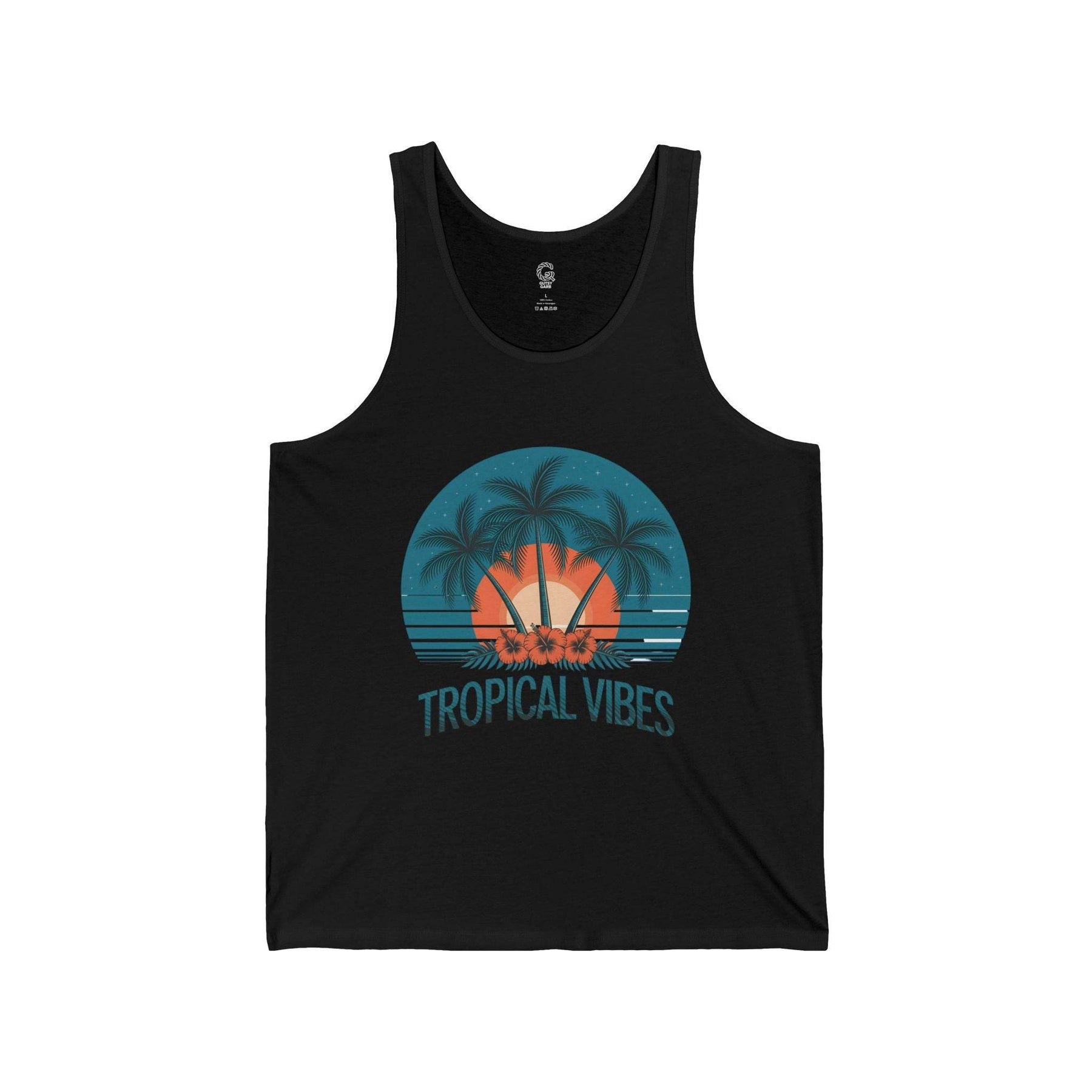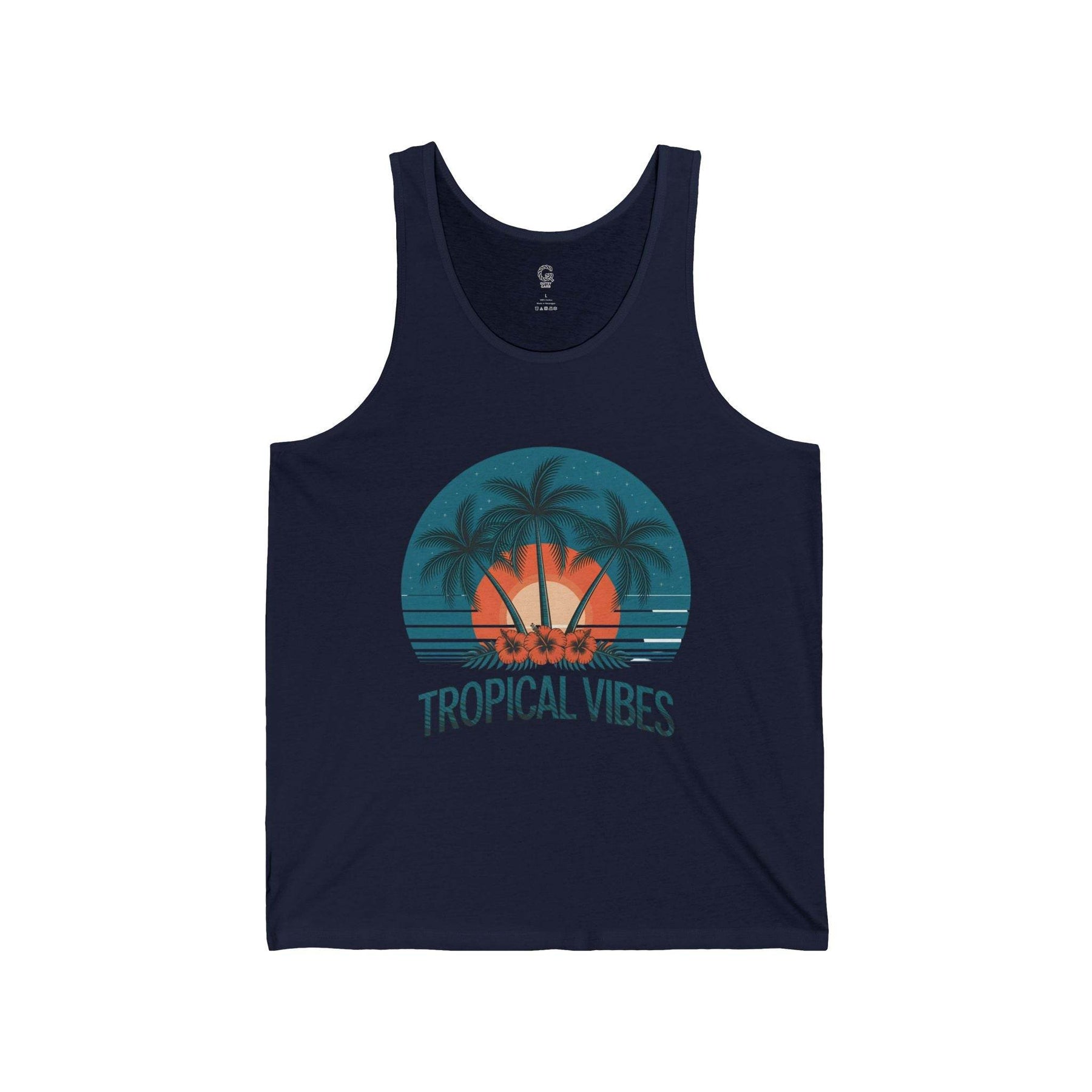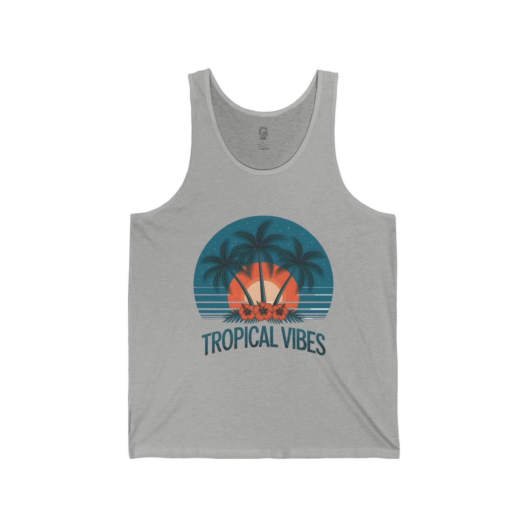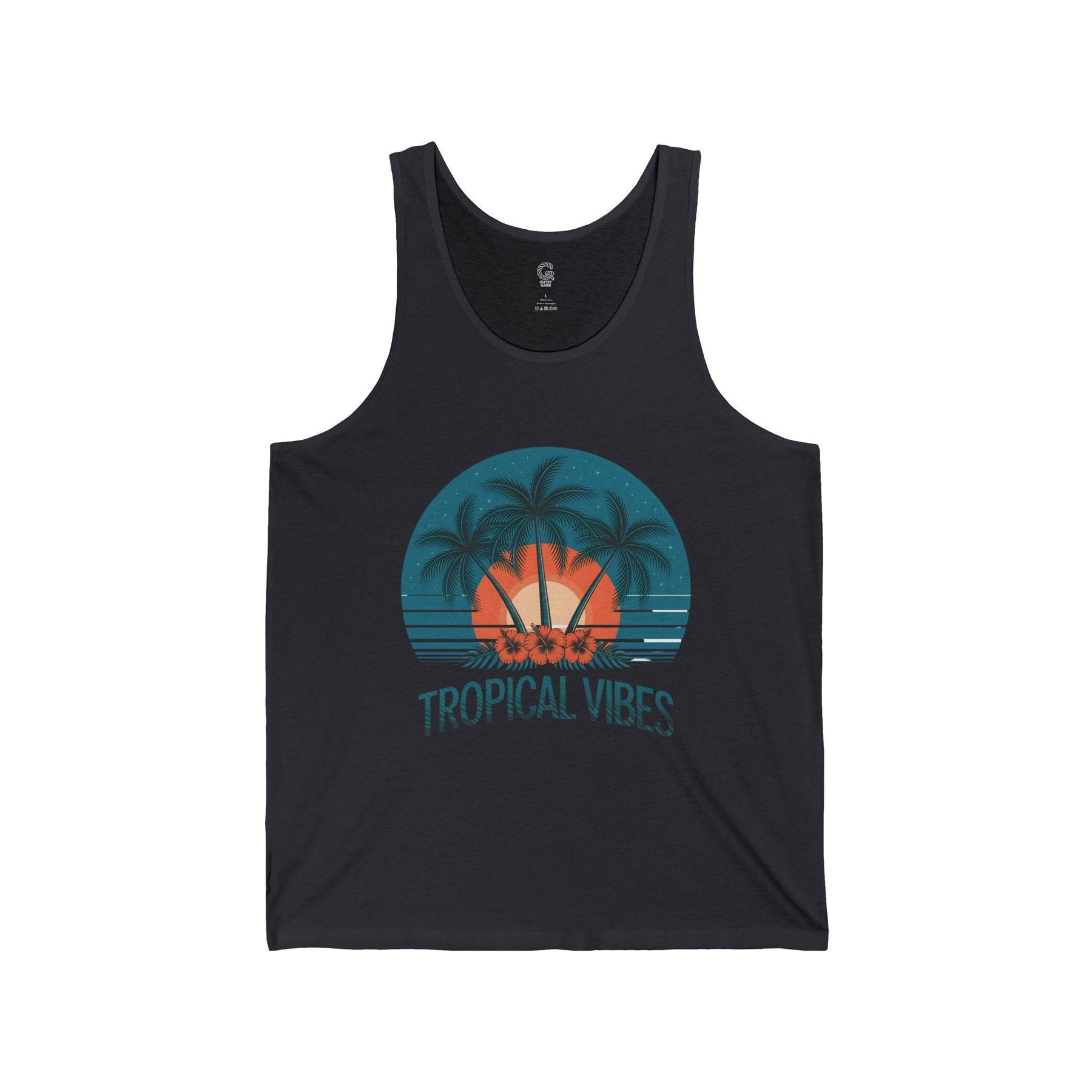 Stand out at the beach with the Tropical Breeze Unisex Tank. This summer unisex beach tank from Gutsy Garb features a unique design inspired by sunny days and cool ocean breezes. The bold print includes palm trees and a vibrant sunset, perfect for anyone who wants to show off confidence and style.