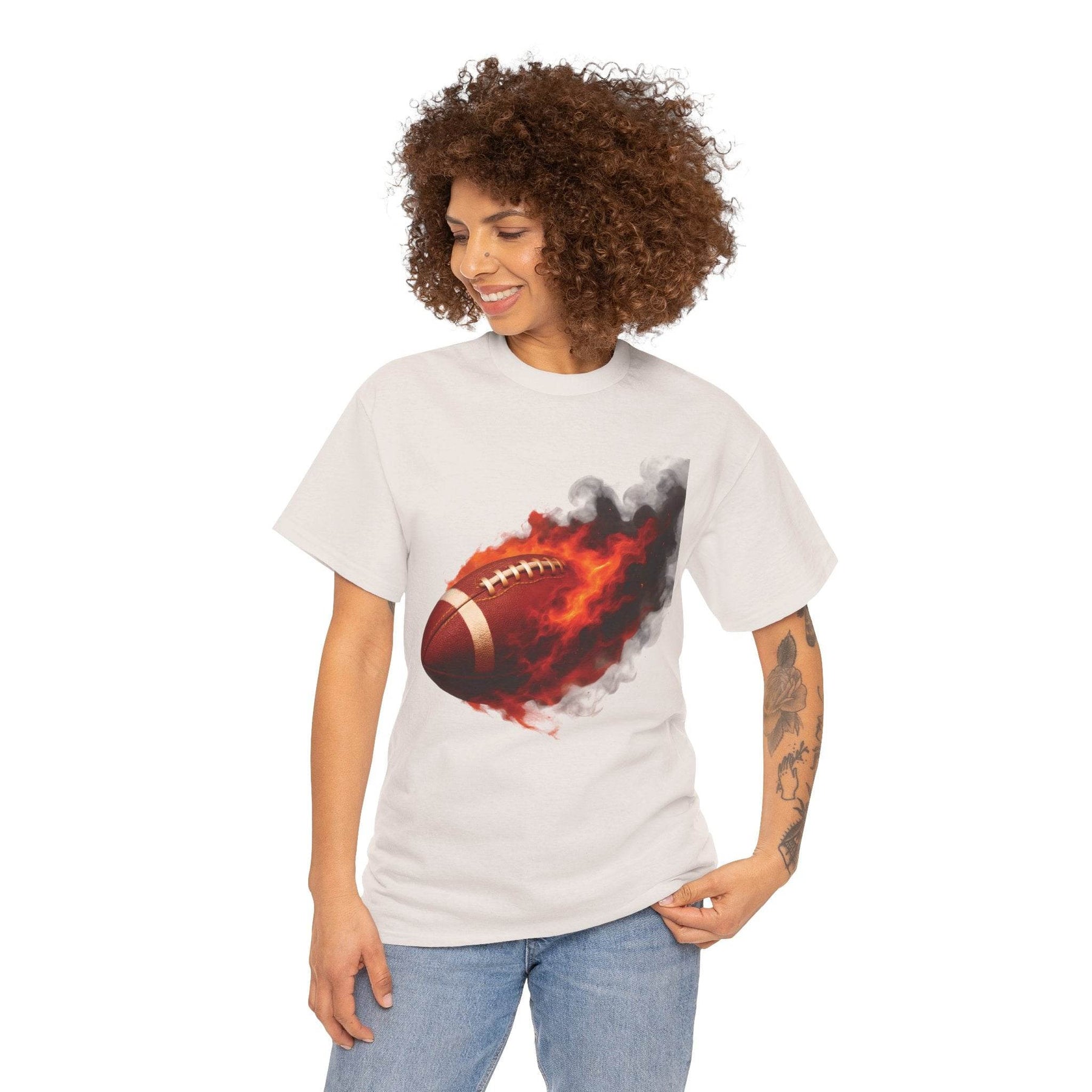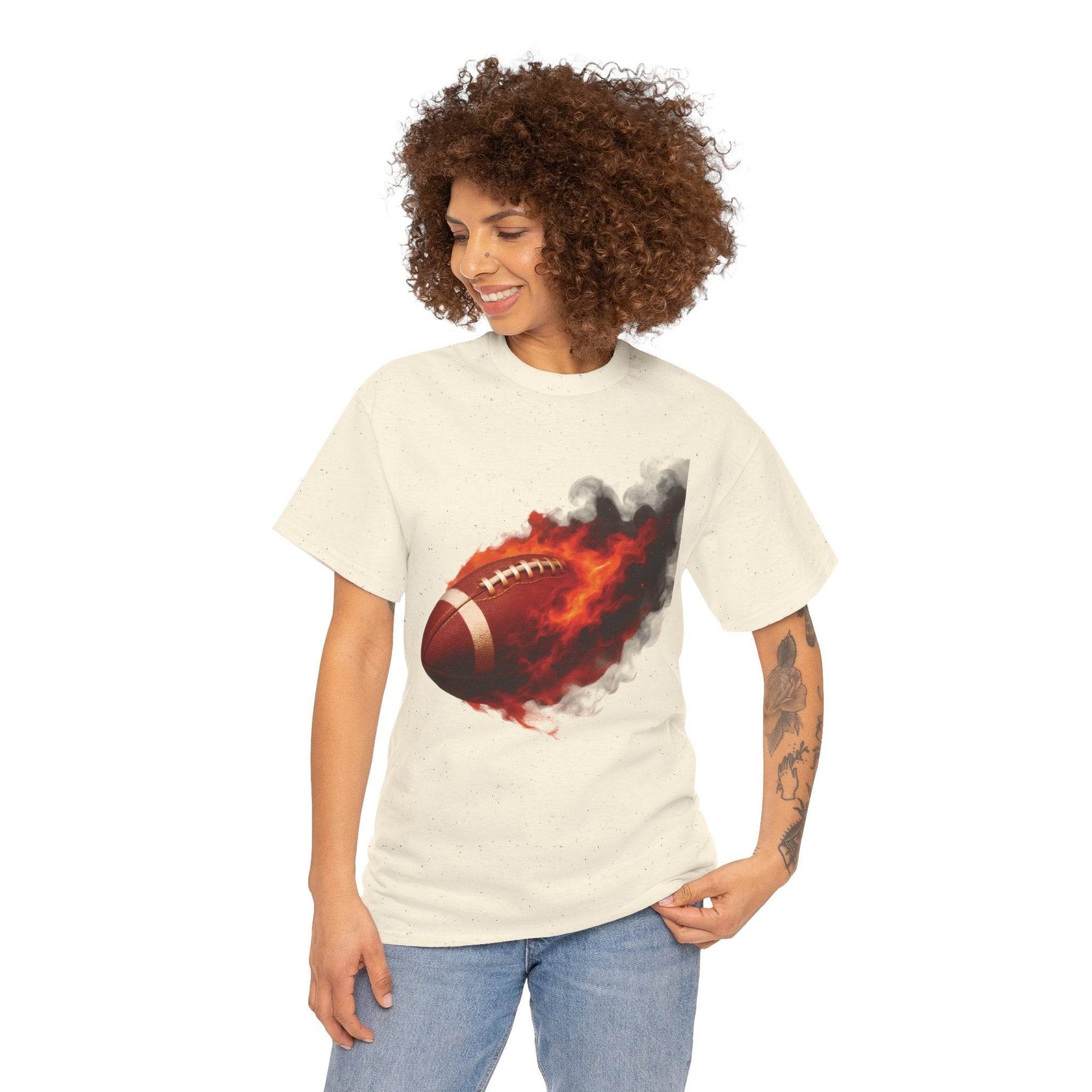 Add a bold edge to your wardrobe with the Flaming Football Unisex Heavy Cotton Tee. This statement piece stands out in any crowd. It is crafted for comfort and style. This shirt is part of the athletic apparel for football lovers collection. The heavy cotton fabric feels soft against your skin. It holds its shape all day. The fiery football graphic pops on the rich blue background. The print stays bright, wash after wash.