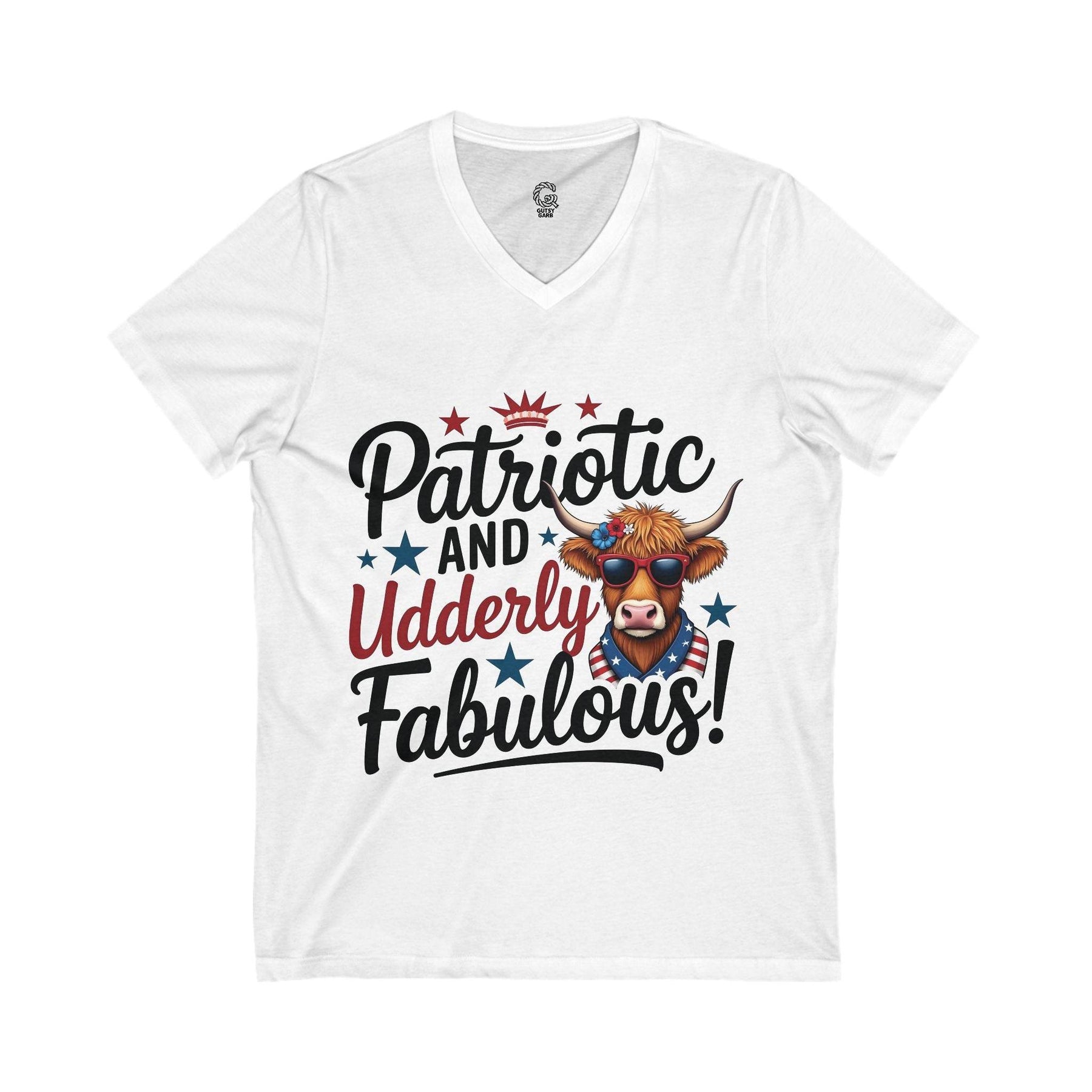 Stand out at every event with the Patriotic Cow V-Neck Tee from Gutsy Garb. This unisex design is made for anyone who loves to showcase their playful side. The patriotic cow t-shirt brings together bold style and comfort. Soft fabric feels good on your skin. Short sleeves keep you cool all summer.