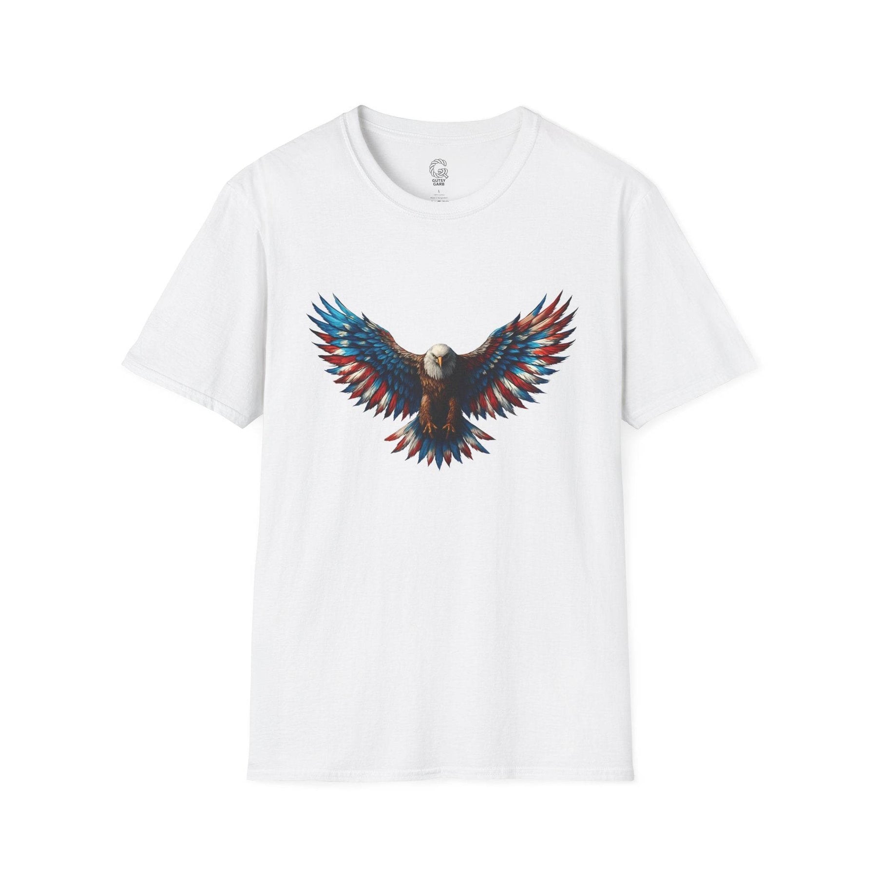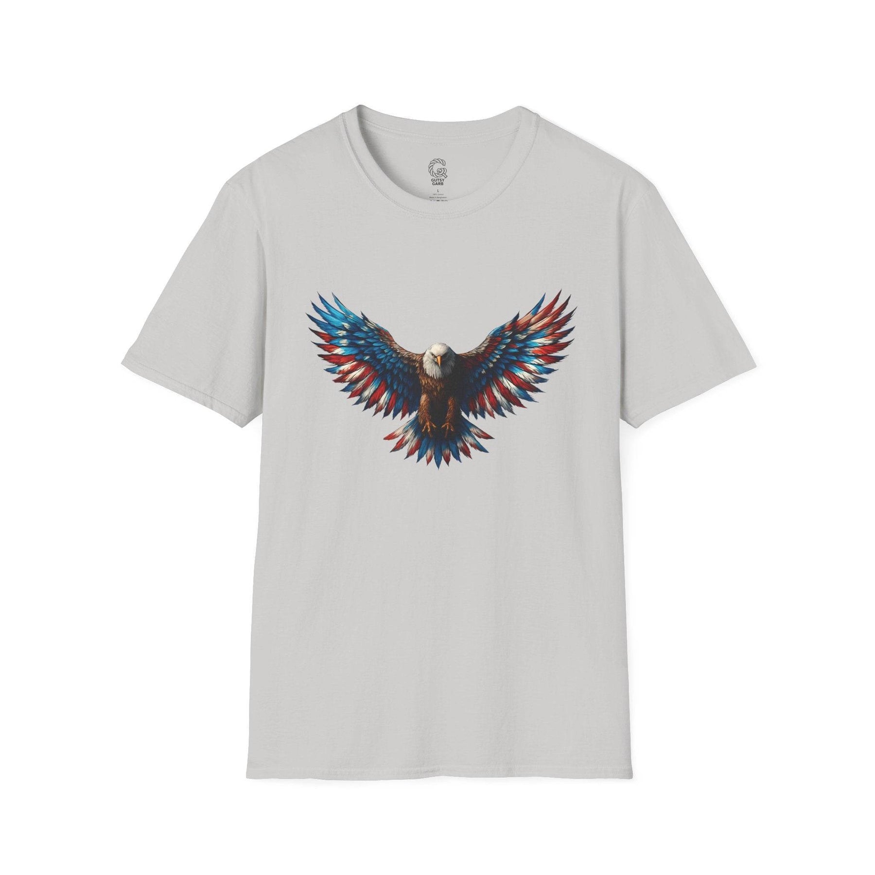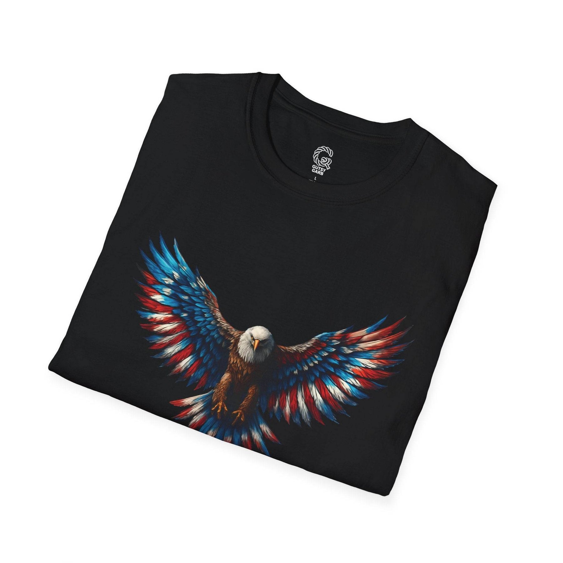 Shop Gutsy Garb for this exclusive patriotic eagle t-shirt. The detailed design pays tribute to a classic symbol of freedom. Unique graphics and comfortable wear combine for an unforgettable wardrobe essential. This tee is more than a shirt—it’s a confident statement. Pick the size that fits you best and let your bold side shine.