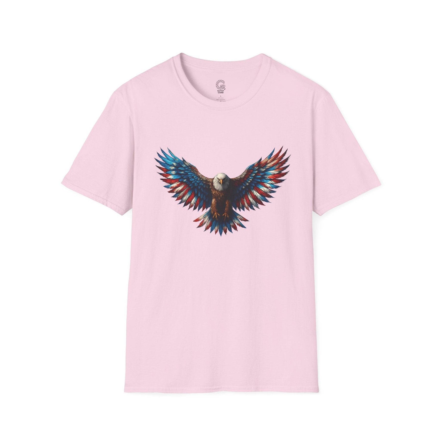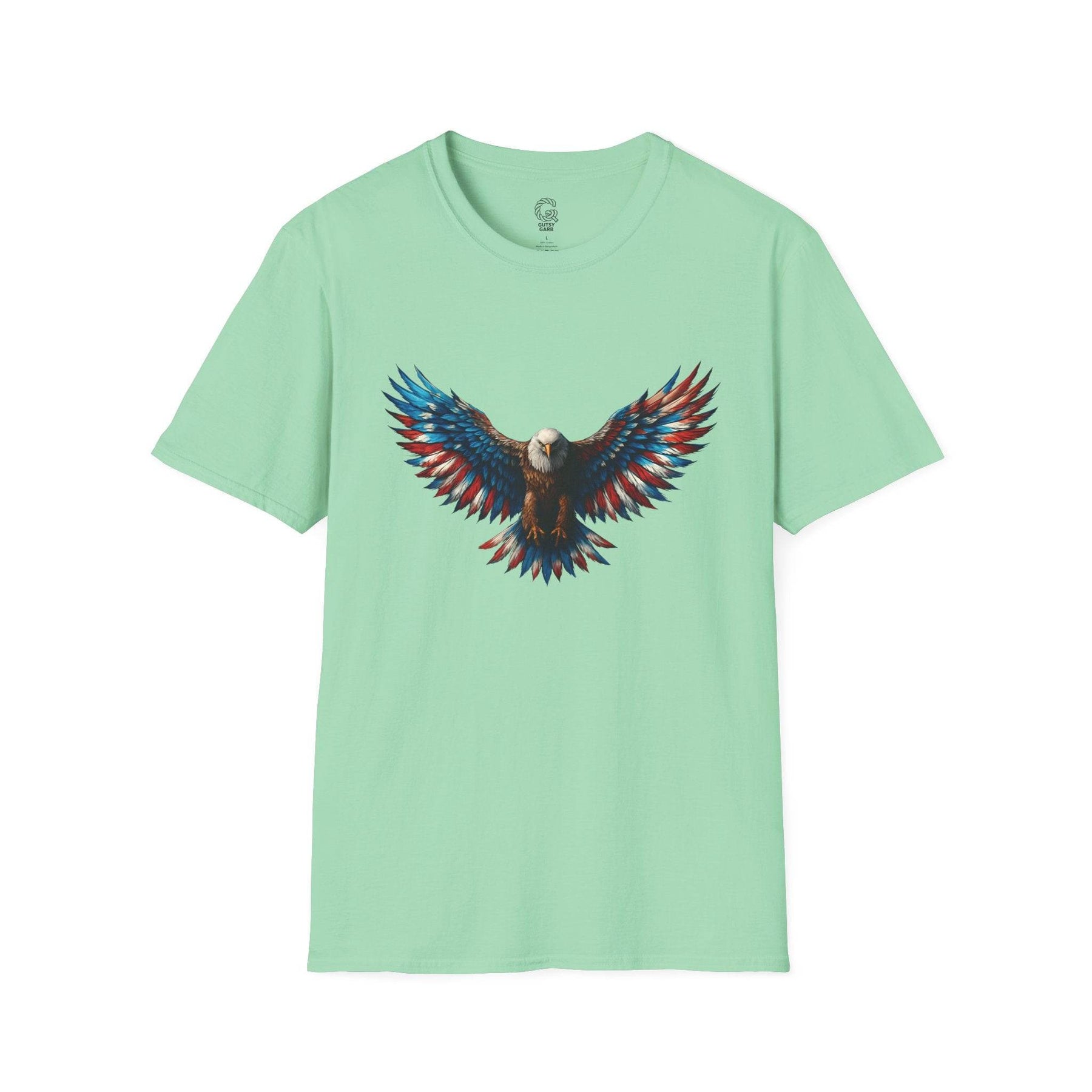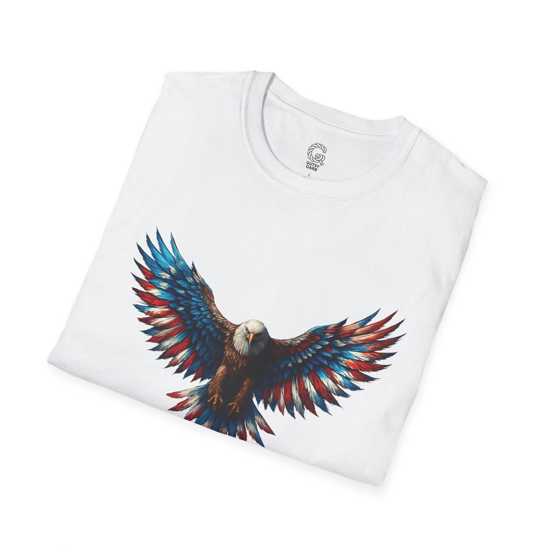 Shop Gutsy Garb for this exclusive patriotic eagle t-shirt. The detailed design pays tribute to a classic symbol of freedom. Unique graphics and comfortable wear combine for an unforgettable wardrobe essential. This tee is more than a shirt—it’s a confident statement. Pick the size that fits you best and let your bold side shine.