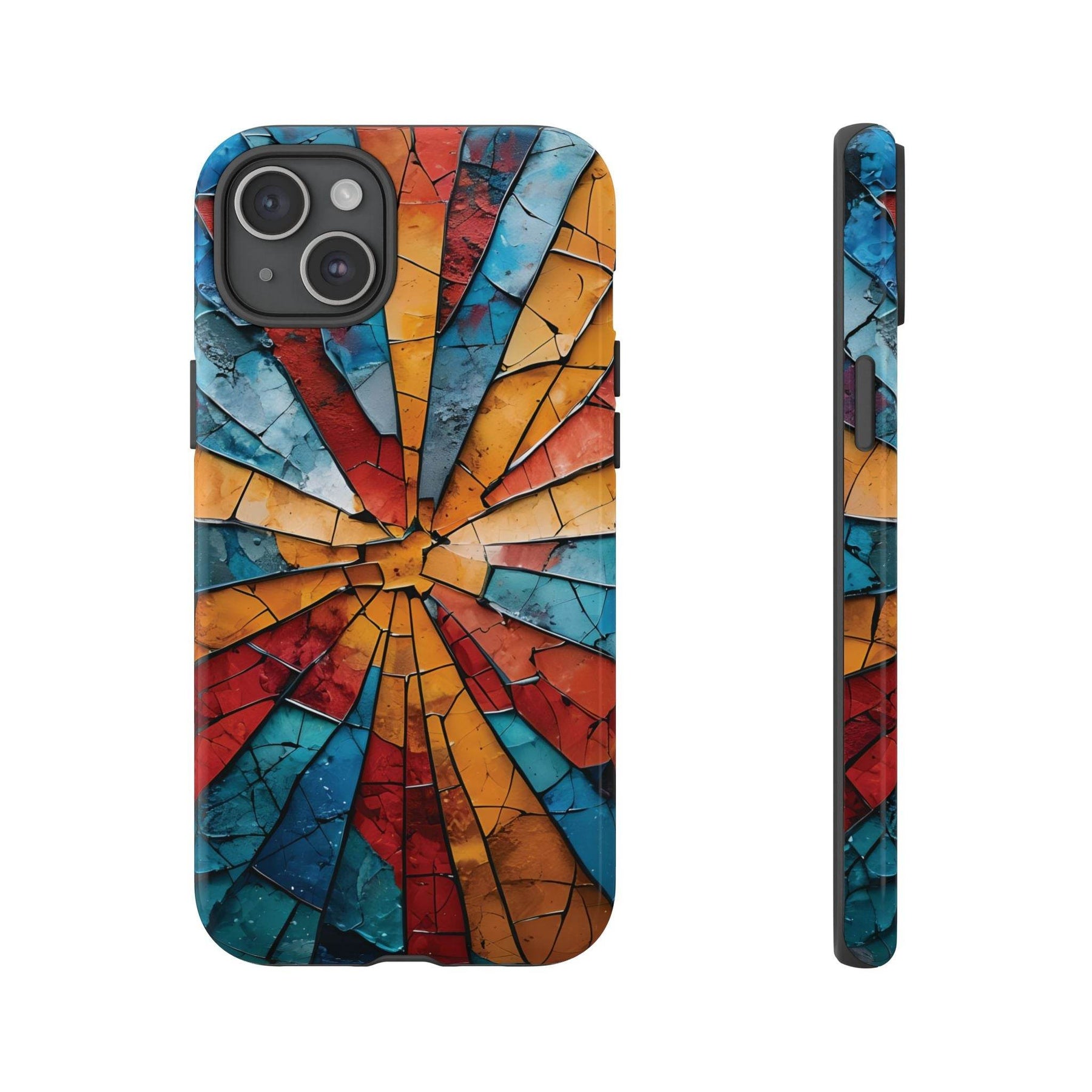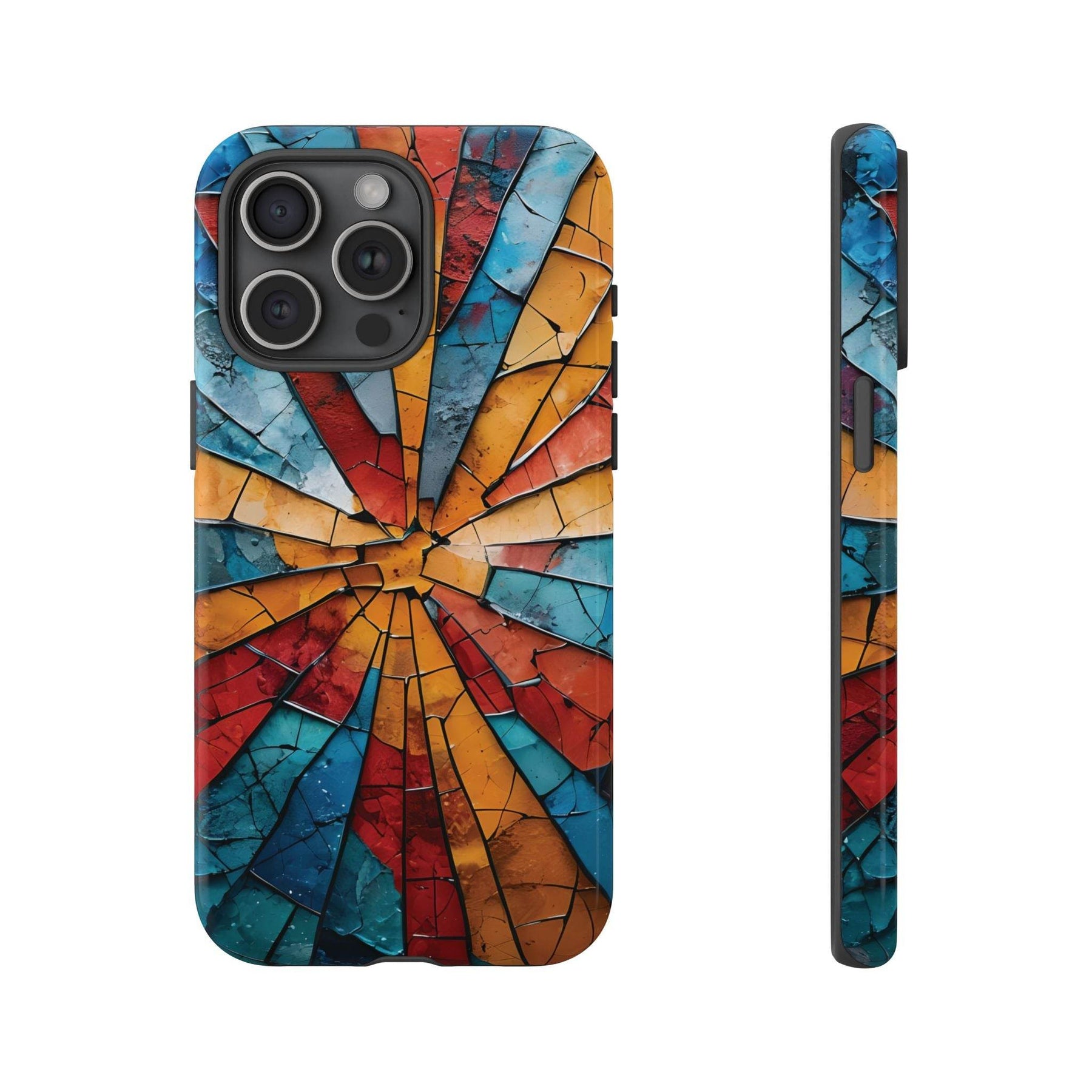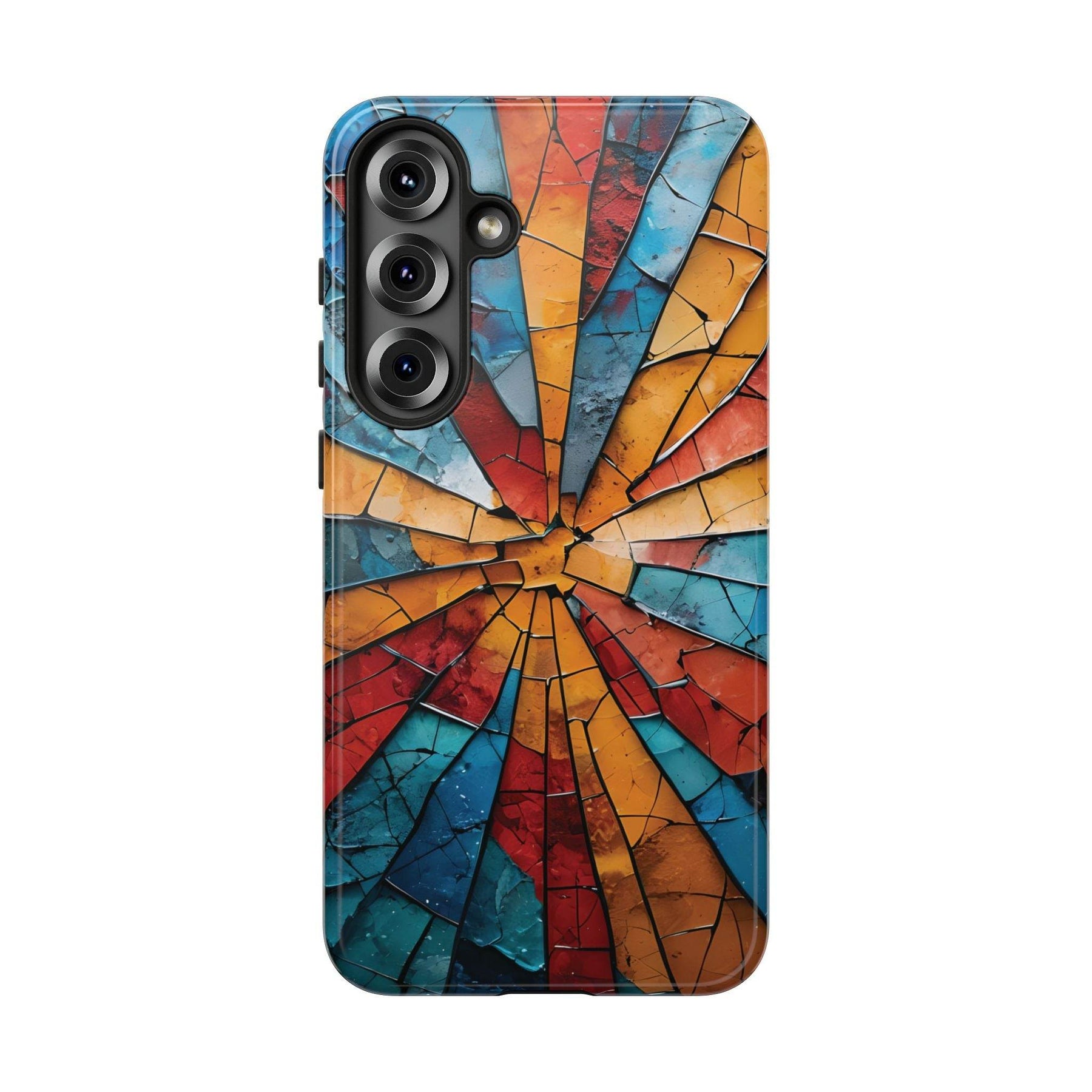 Introducing the Shattered Glass Tough Case from Gutsy Garb. This artistic tough phone case blends bold design with function. Every angle of the phone shows a dynamic shattered glass pattern. The colors are vivid. Blue, red, and orange shards make every phone unique.
