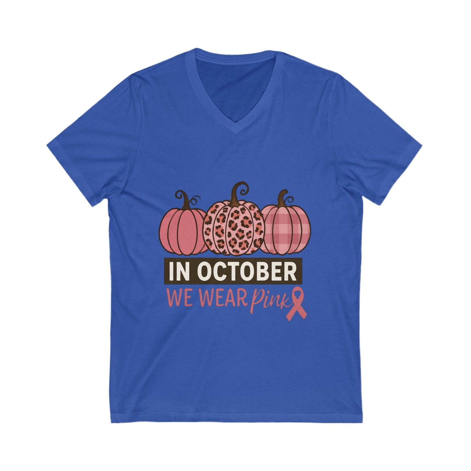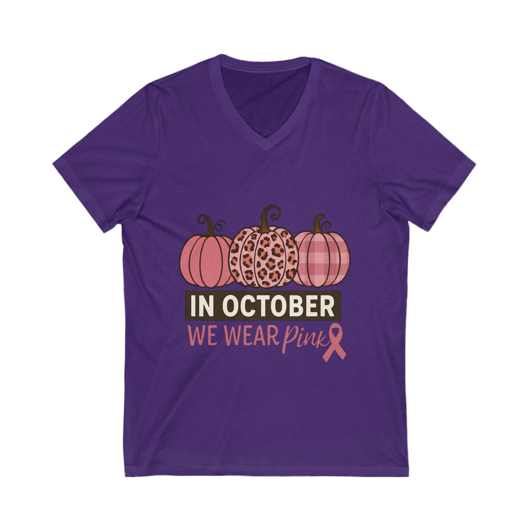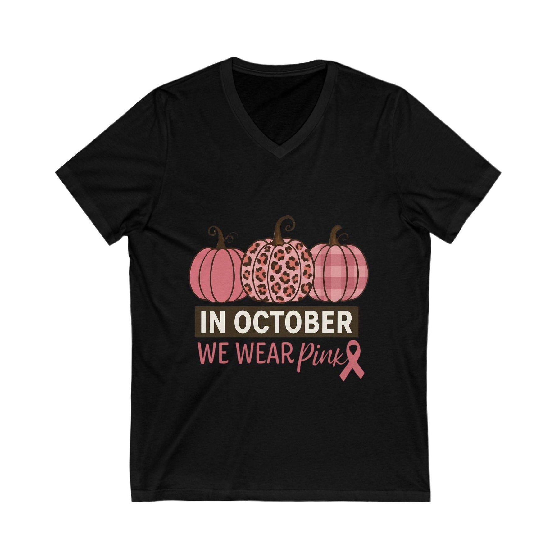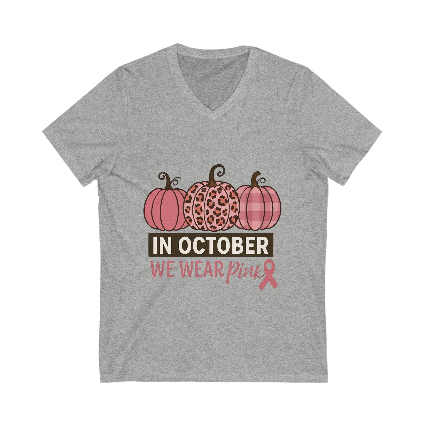 Show your spirit with the October Awareness V-Neck Tee. This fall breast cancer support t-shirt combines style and purpose. The unique pumpkin graphic on the front stands out. The soft fabric feels gentle on your skin and suits daily wear.