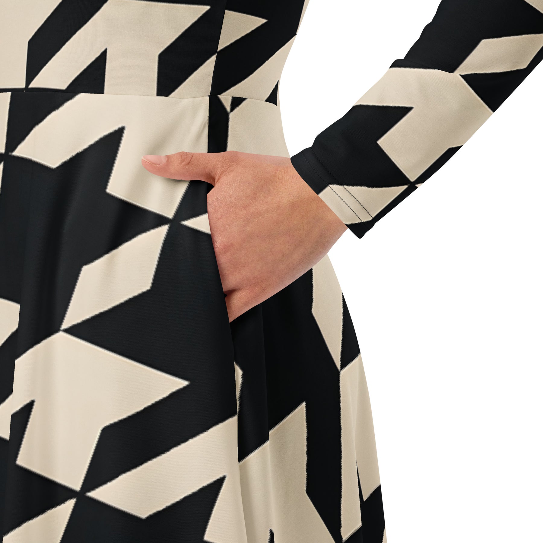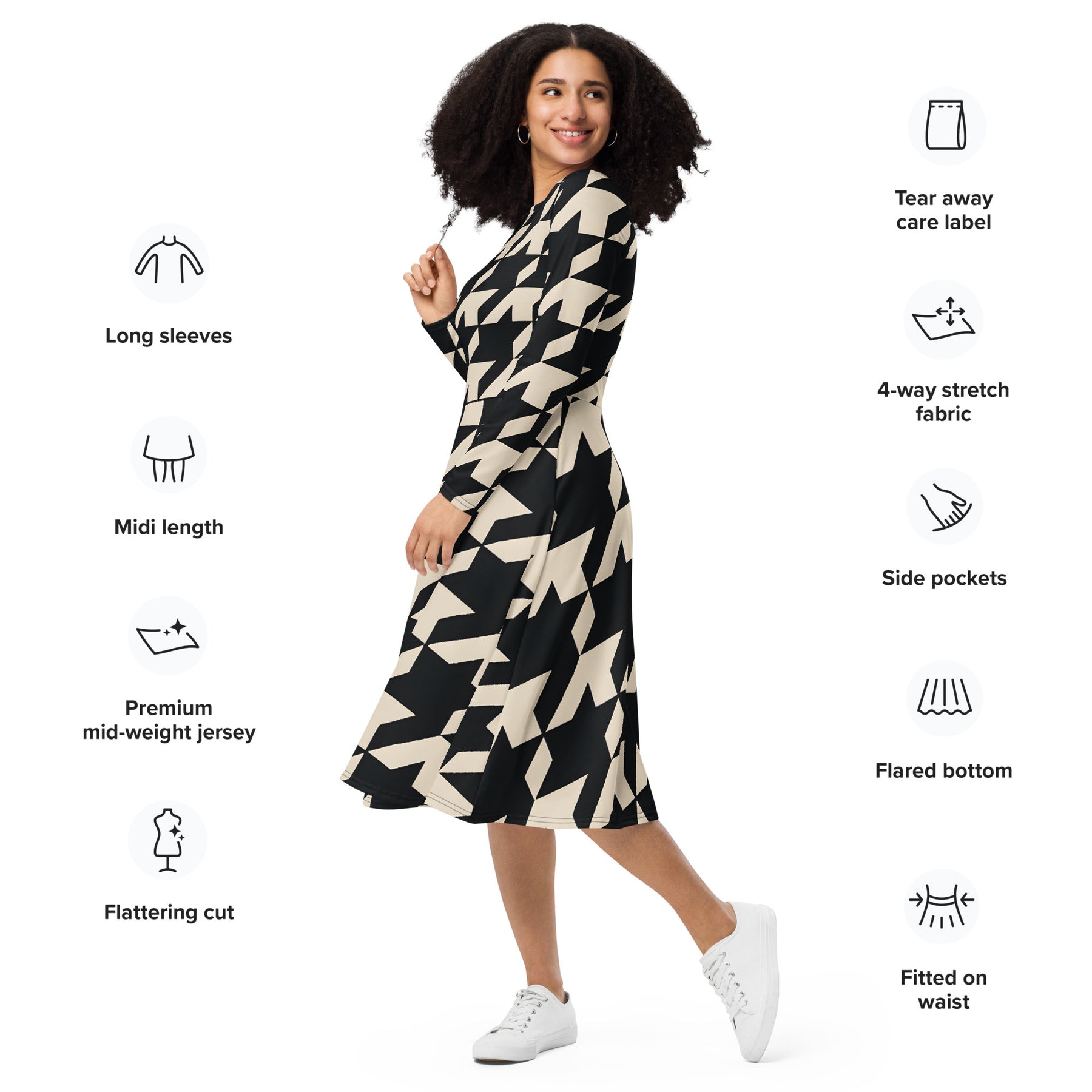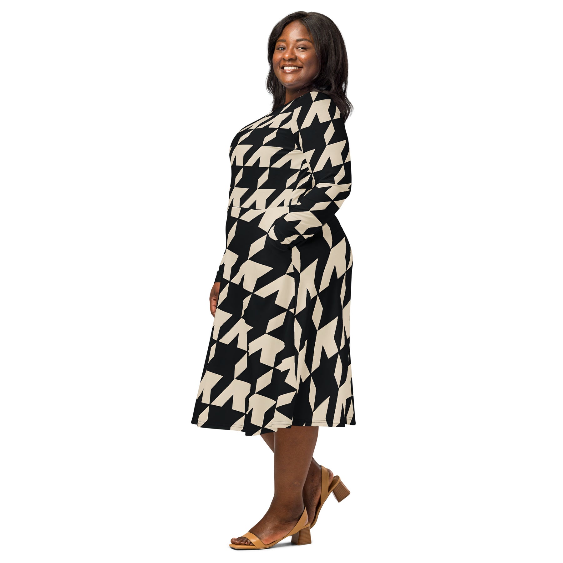 The houndstooth midi dress offers a flattering cut that follows your natural shape. The flared bottom moves easily when you walk. You get long sleeves for extra coverage and comfort. The fitted waist highlights your silhouette without feeling tight.
