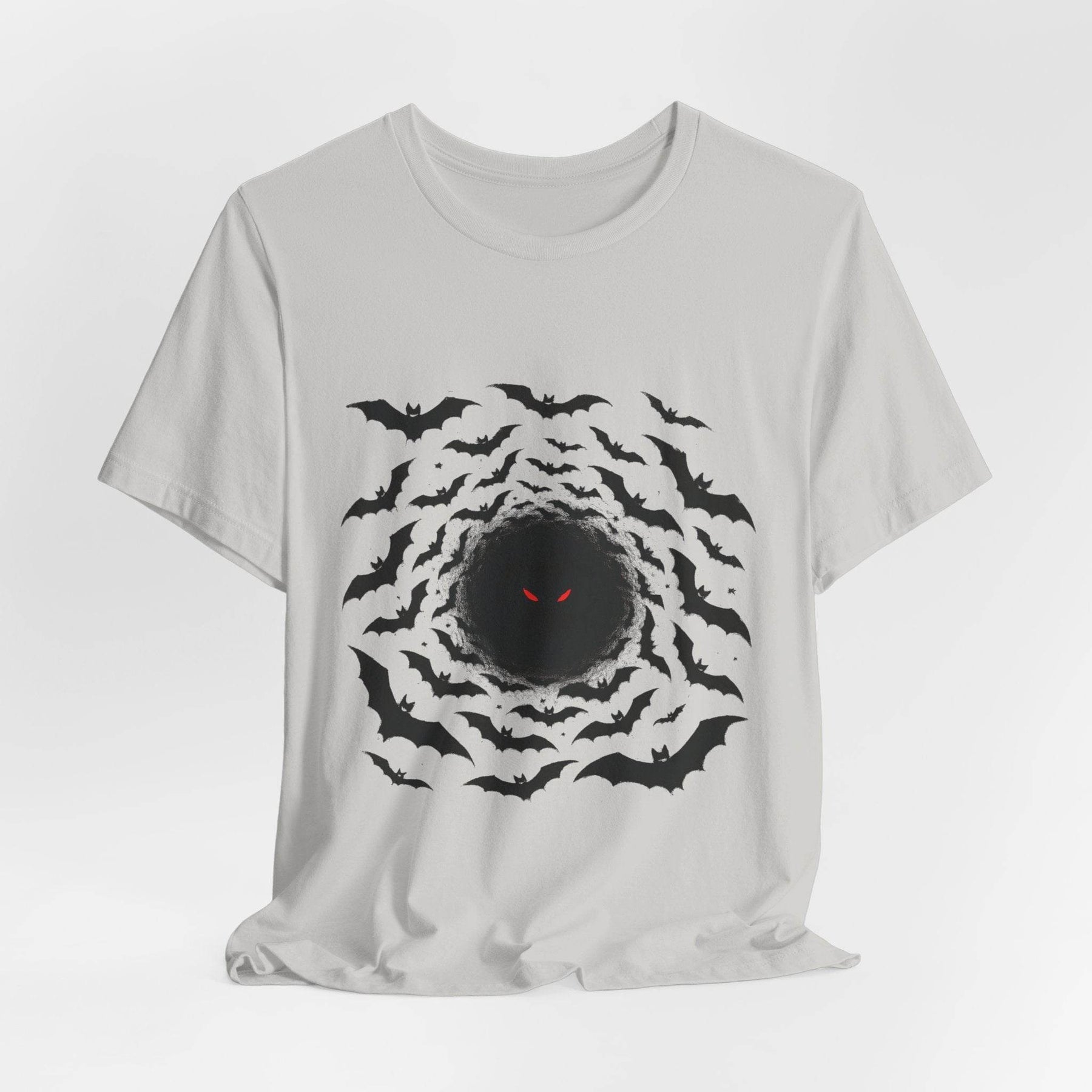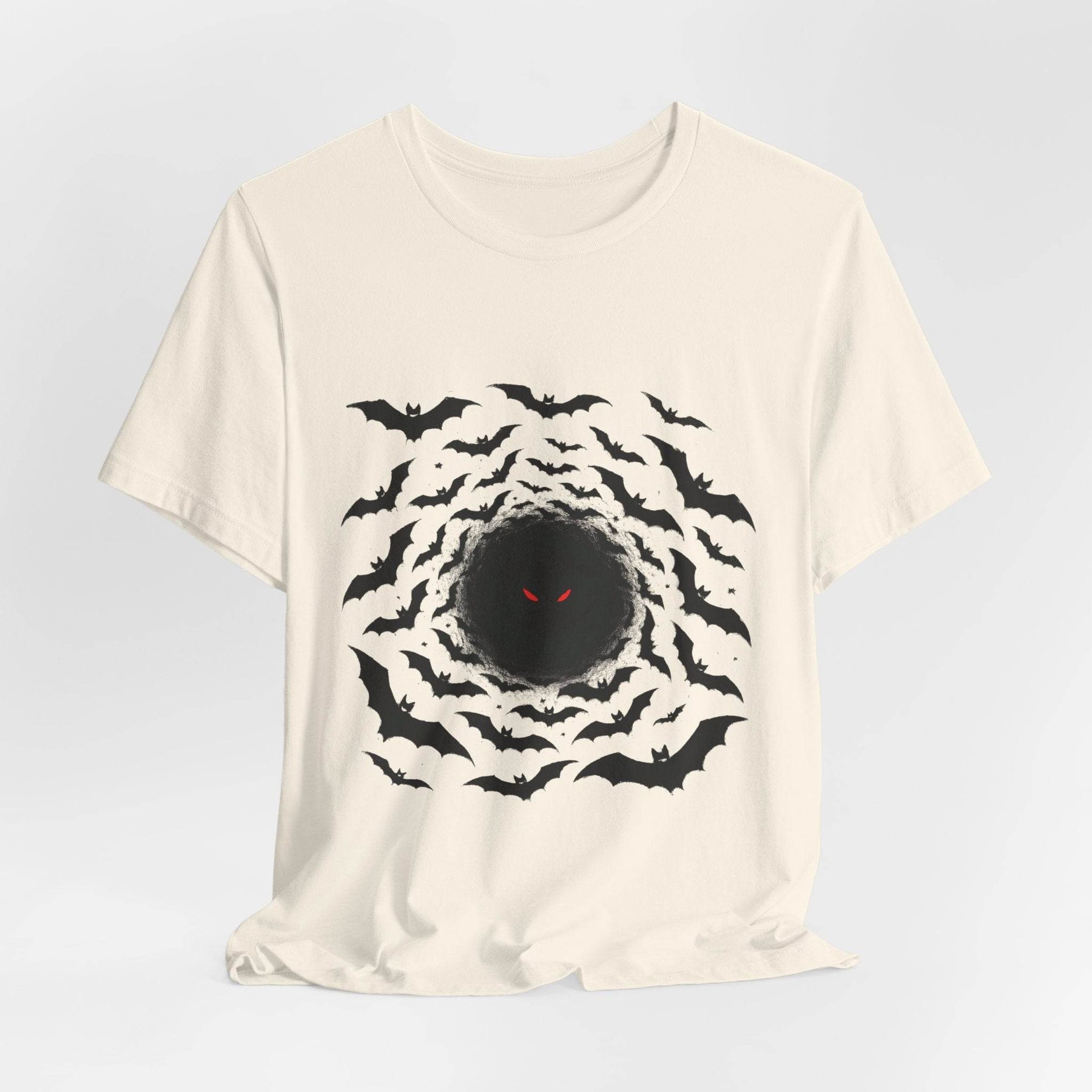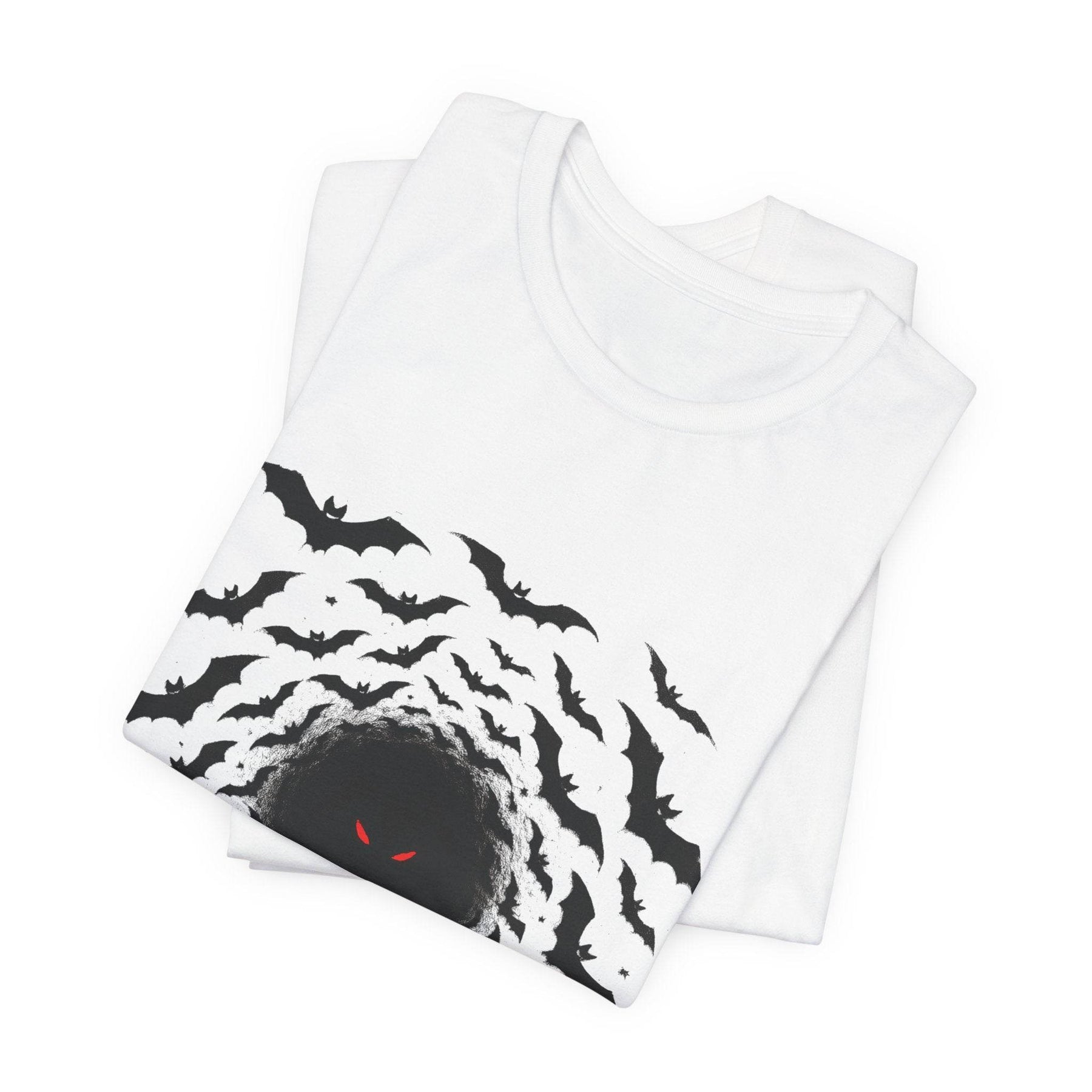 Step out in style with the bat vortex halloween shirt from Gutsy Garb. This tee brings a swirl of bold bats around a dark center with glowing red eyes. The design stands out on crisp, high-quality fabric. Each detail highlights your love for edgy and unique Halloween apparel.