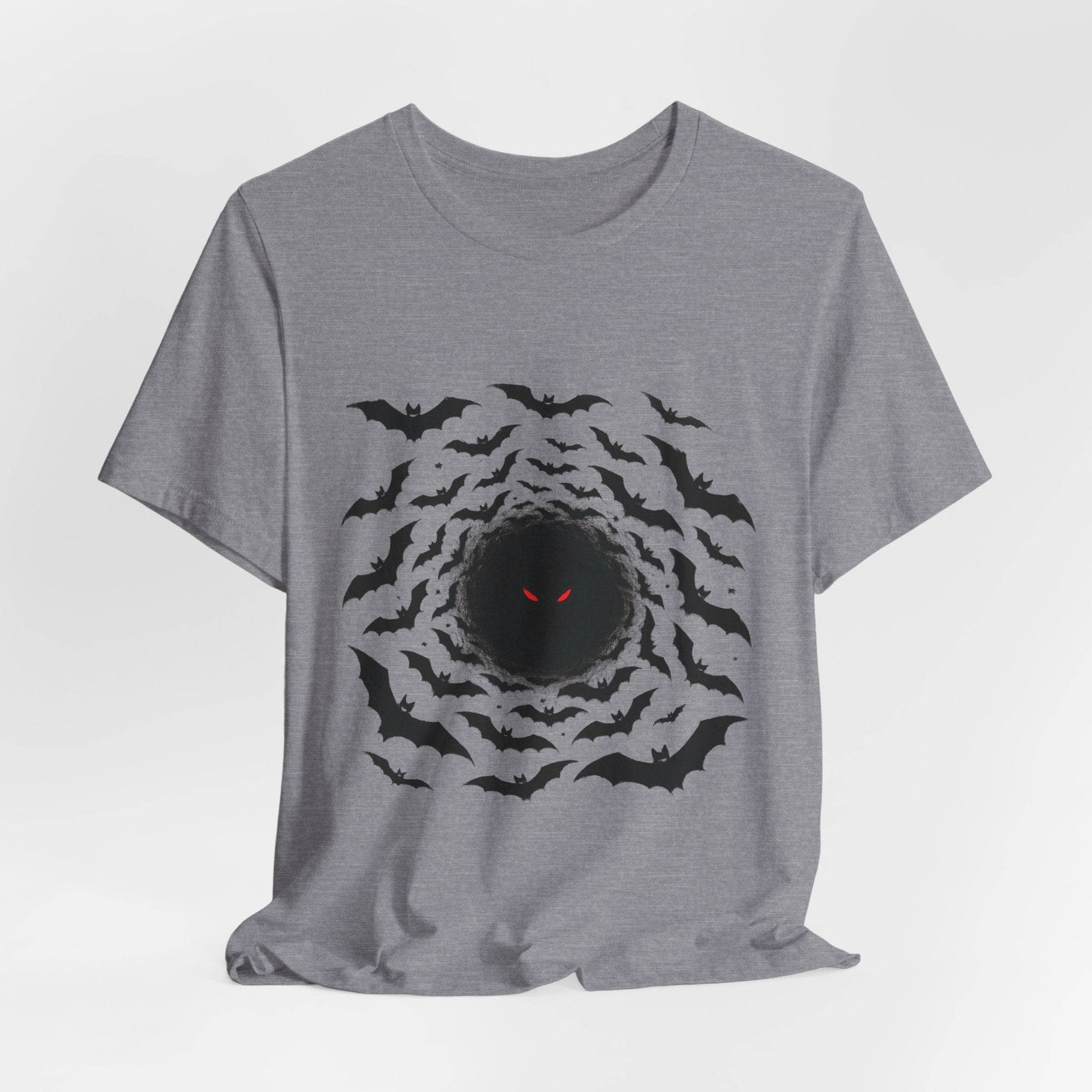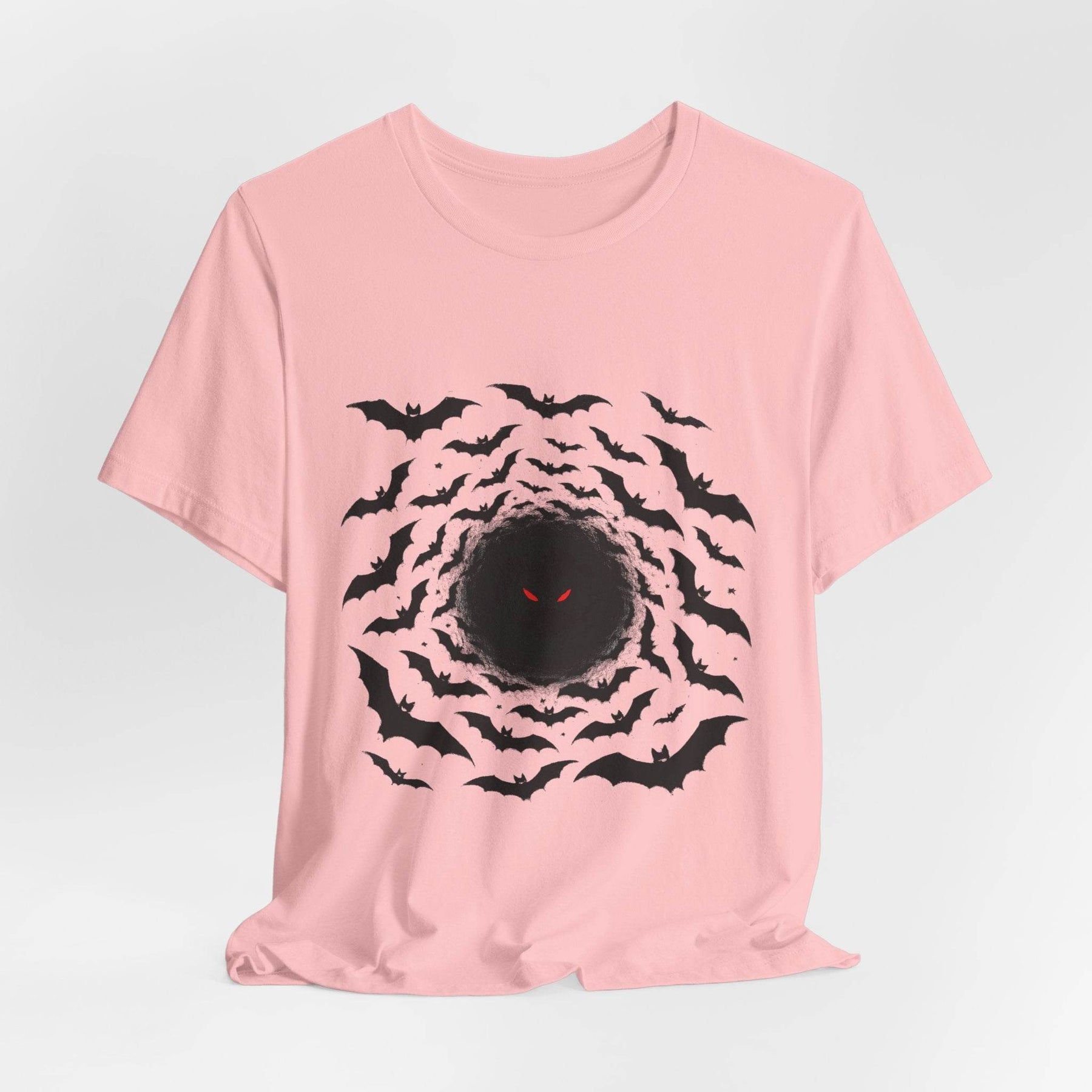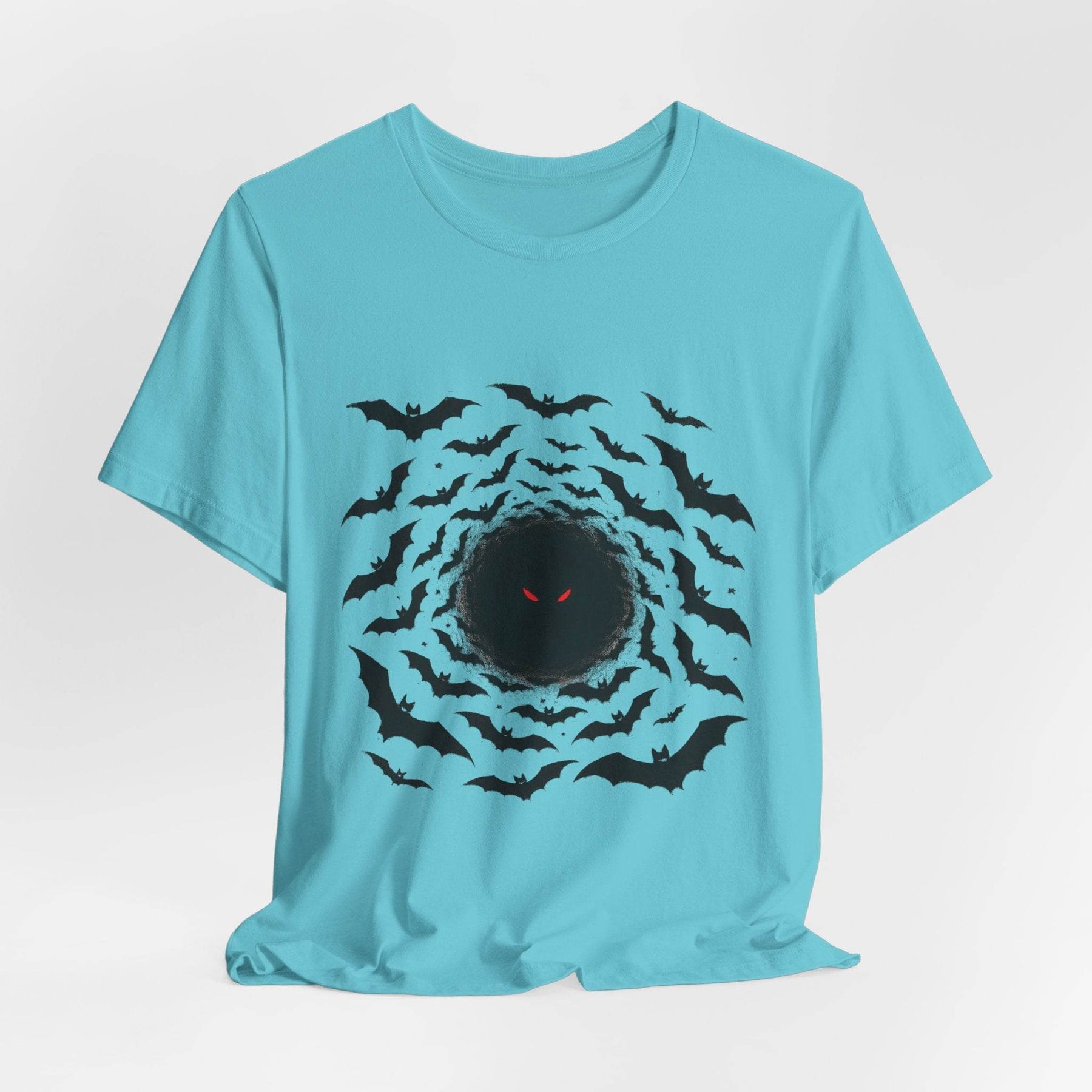 Step out in style with the bat vortex halloween shirt from Gutsy Garb. This tee brings a swirl of bold bats around a dark center with glowing red eyes. The design stands out on crisp, high-quality fabric. Each detail highlights your love for edgy and unique Halloween apparel.
