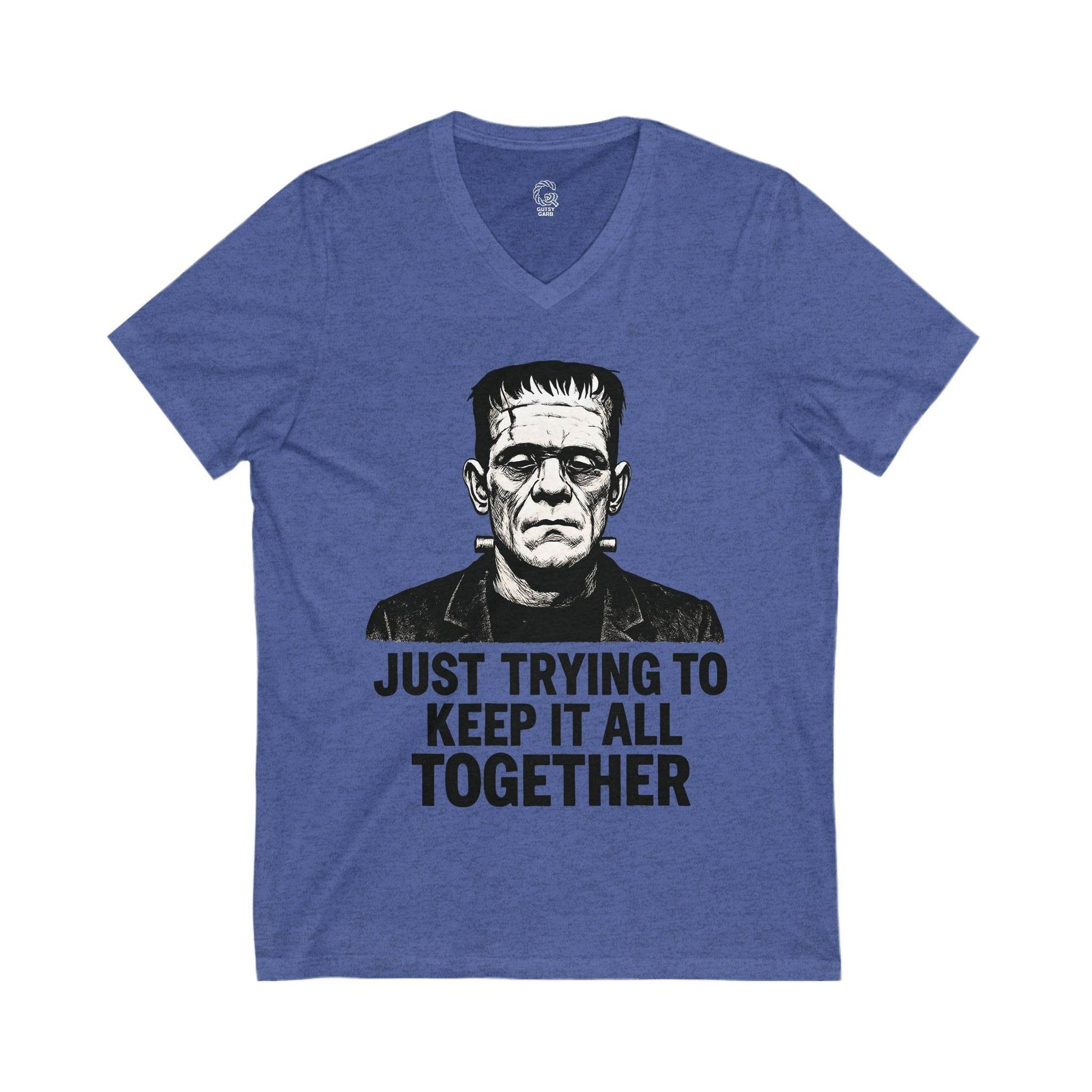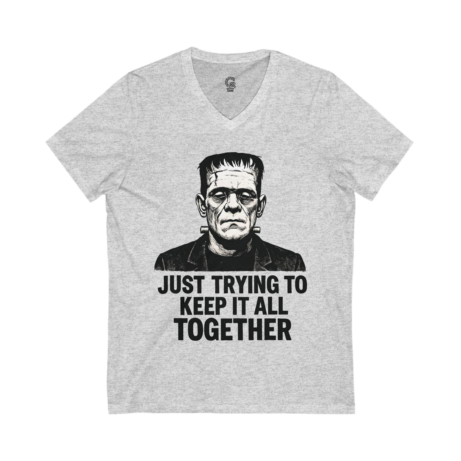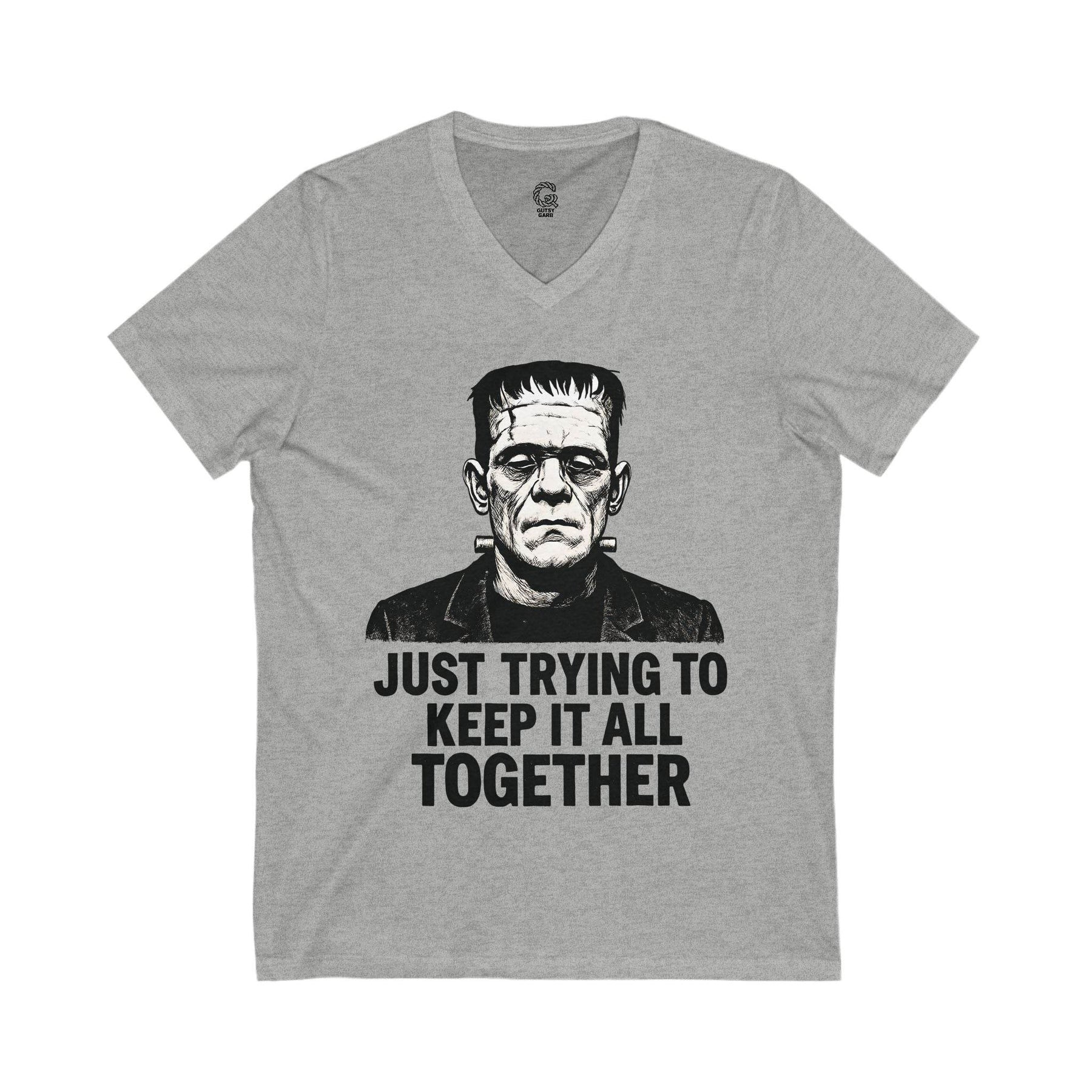 Step into bold style with the Frankenstein graphic tee from Gutsy Garb. This V-neck shirt features a witty design, mixing classic horror with humor. The iconic Frankenstein print stands out. You get a fun "Just Trying to Keep It All Together" message across the front.