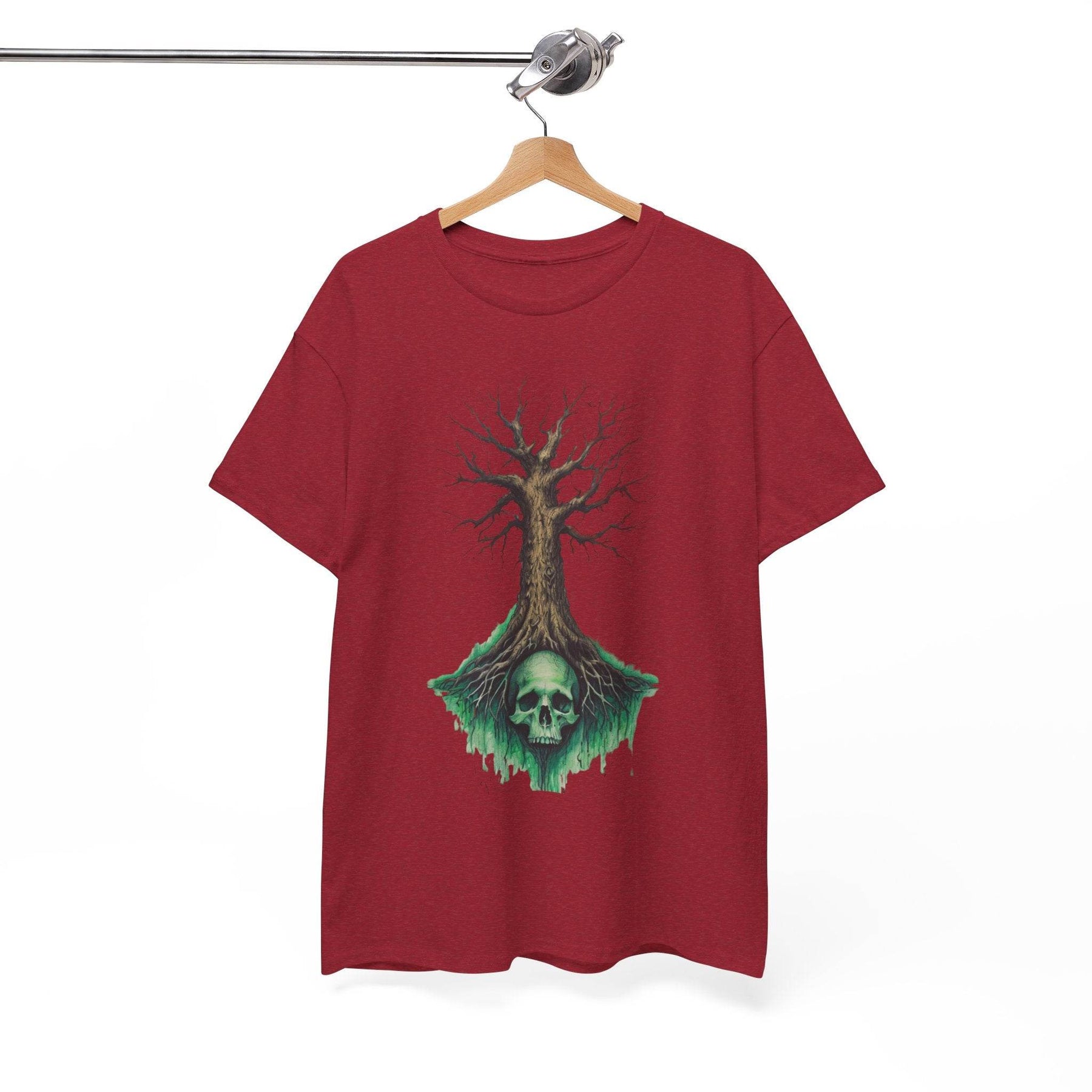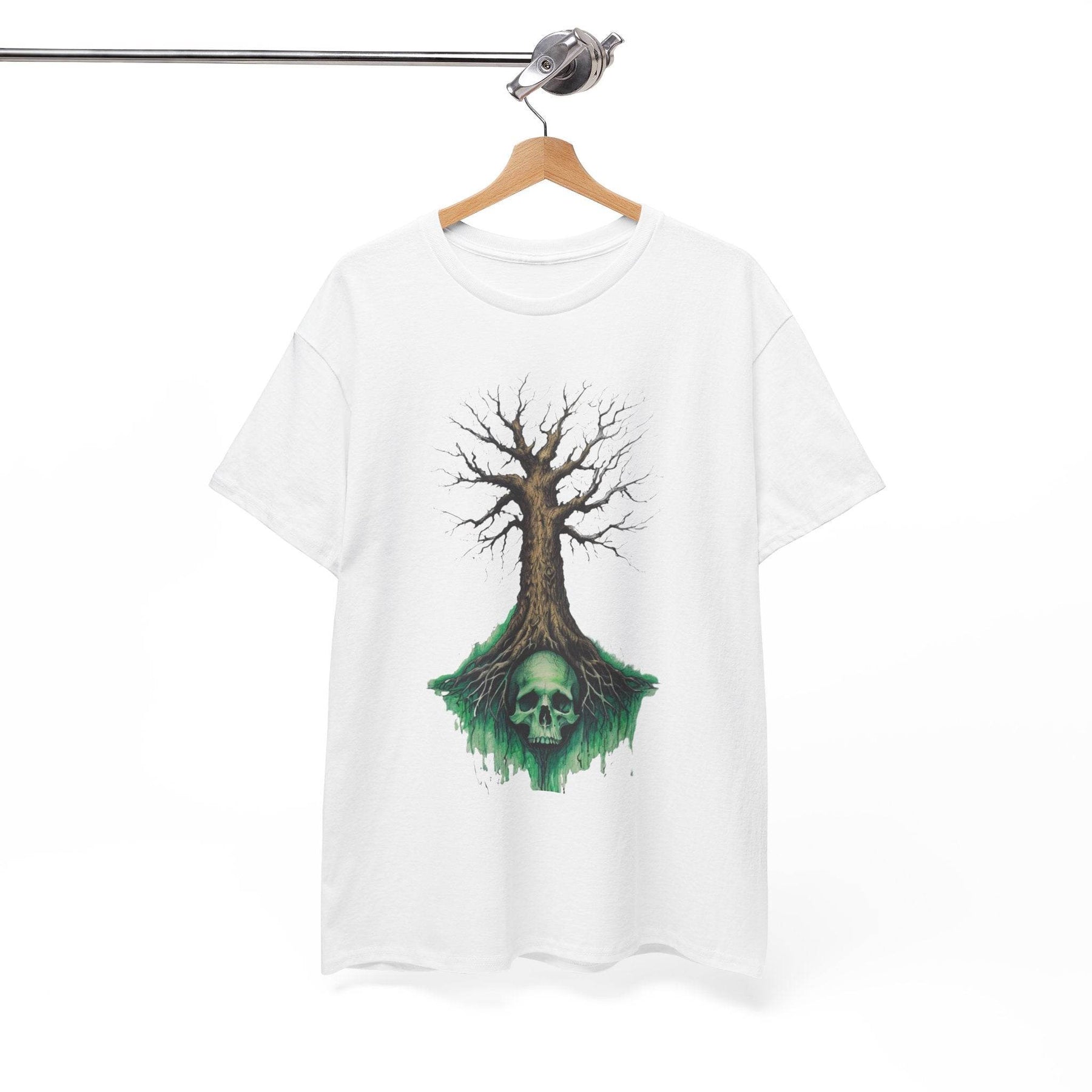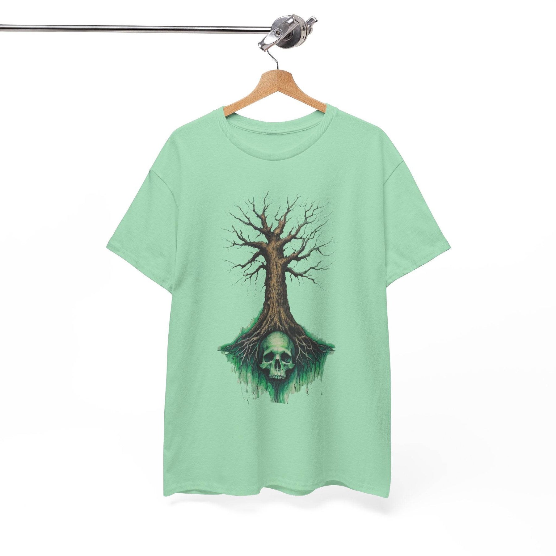 Step into bold style with the gothic tree skull graphic tee. This shirt features a haunting tree rooted above a vivid skull, bringing gothic art to your everyday looks. The design stands out against the heavy cotton fabric, creating a striking contrast for alternative fashion lovers.