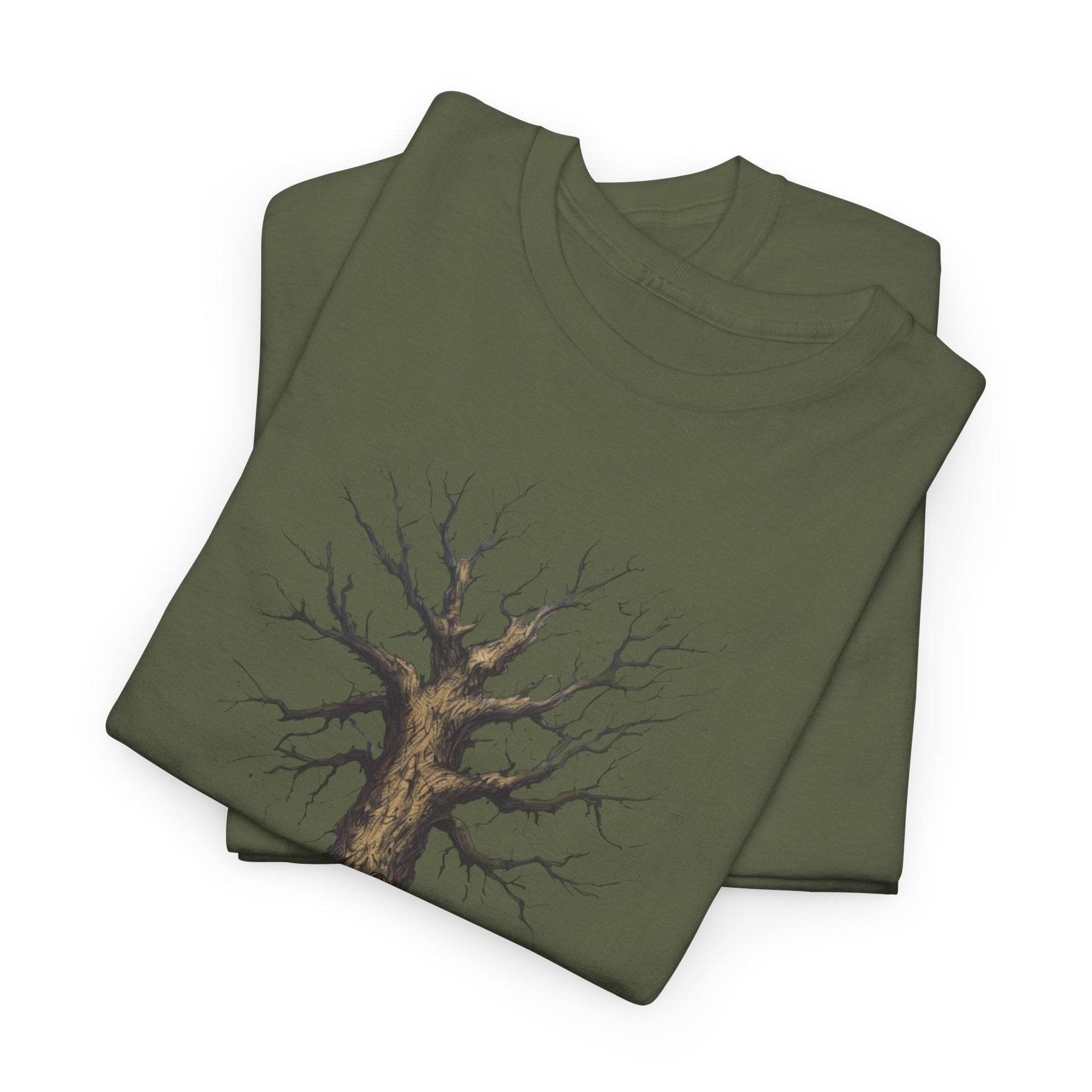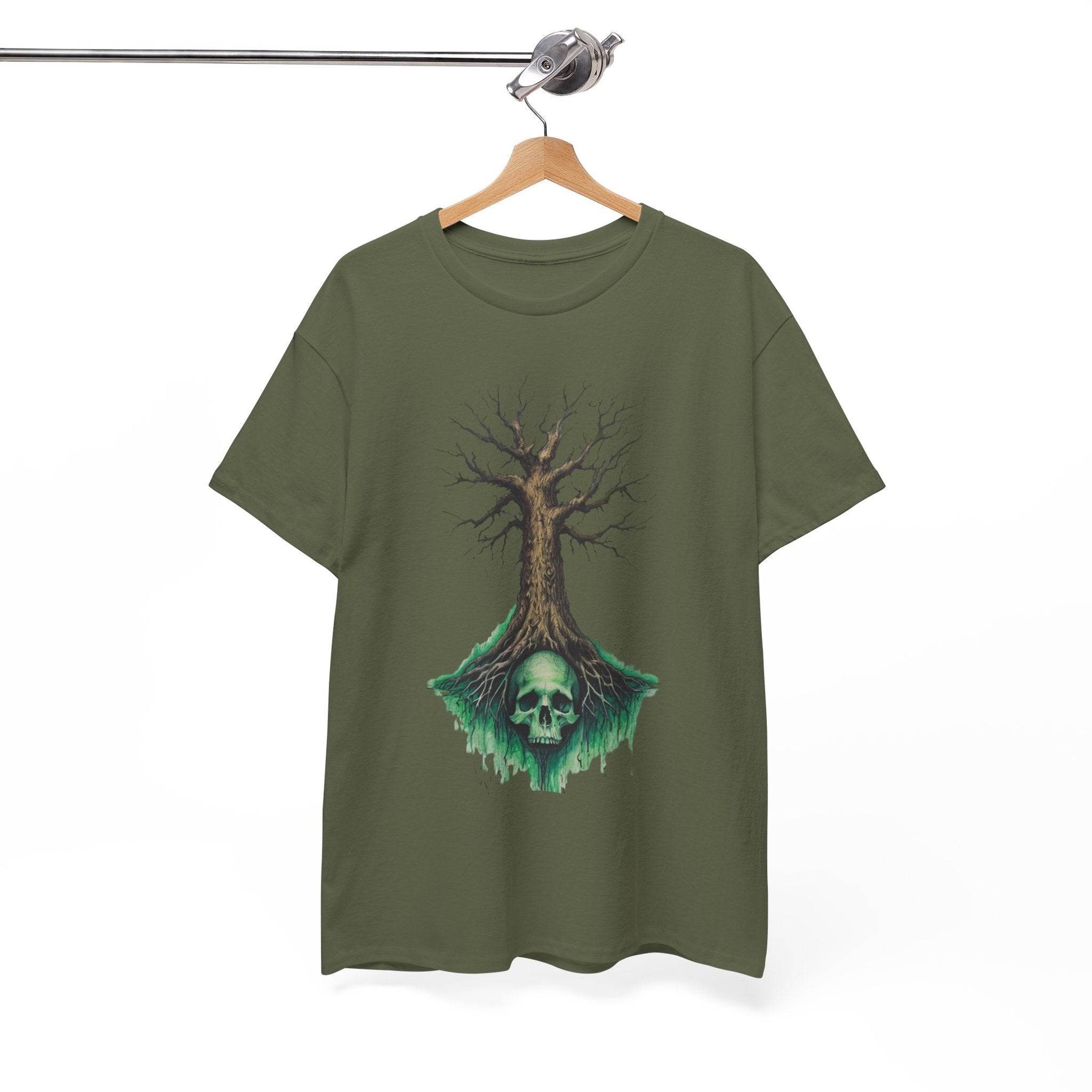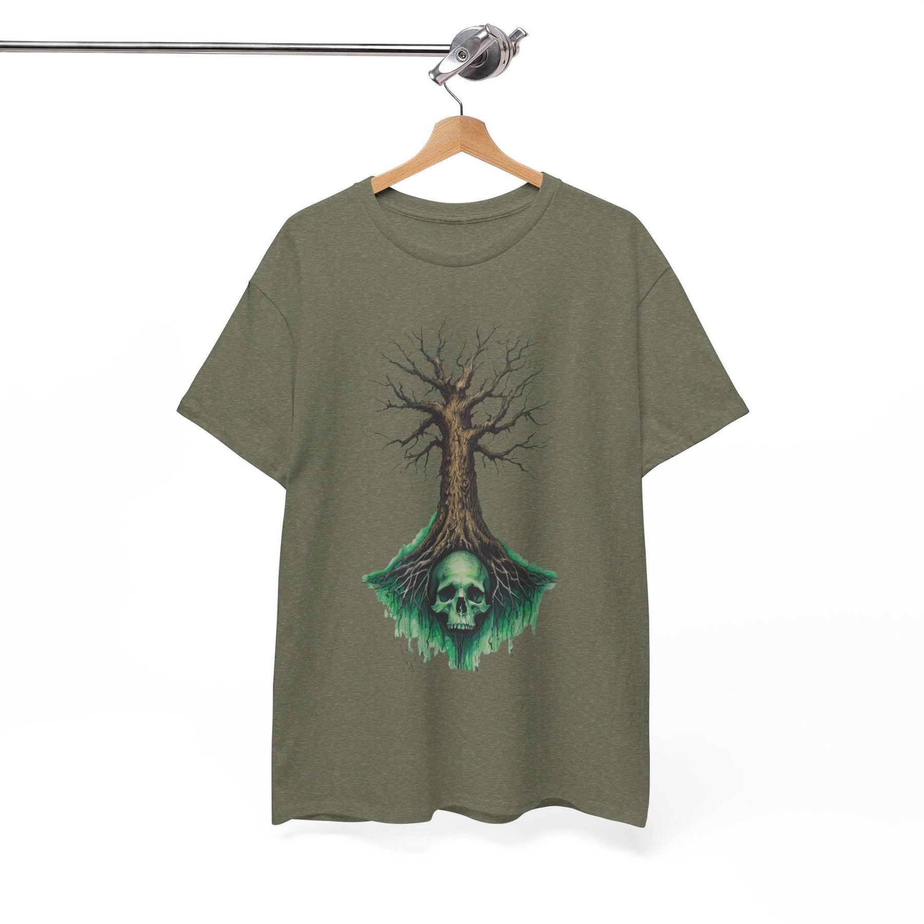 Step into bold style with the gothic tree skull graphic tee. This shirt features a haunting tree rooted above a vivid skull, bringing gothic art to your everyday looks. The design stands out against the heavy cotton fabric, creating a striking contrast for alternative fashion lovers.