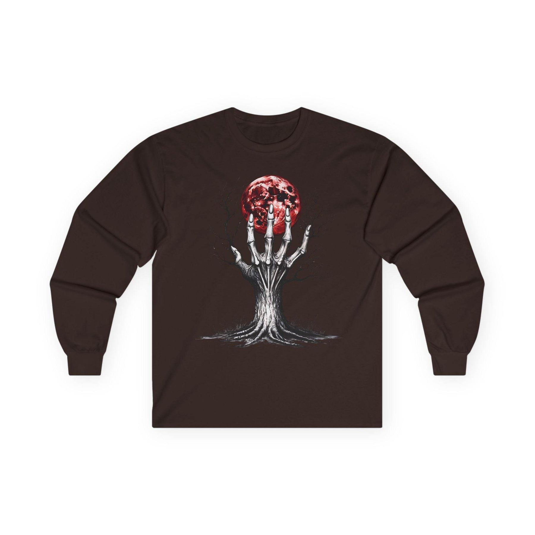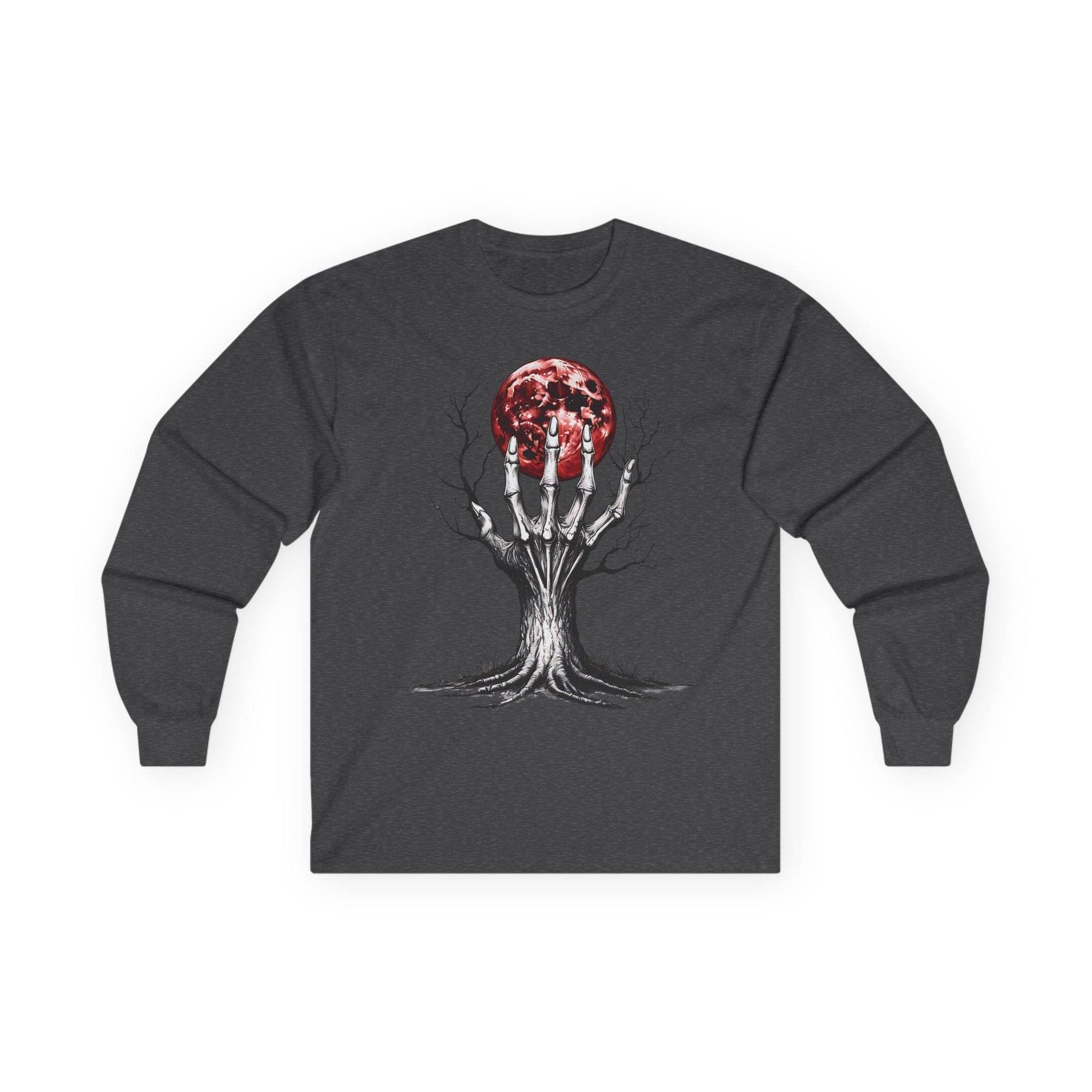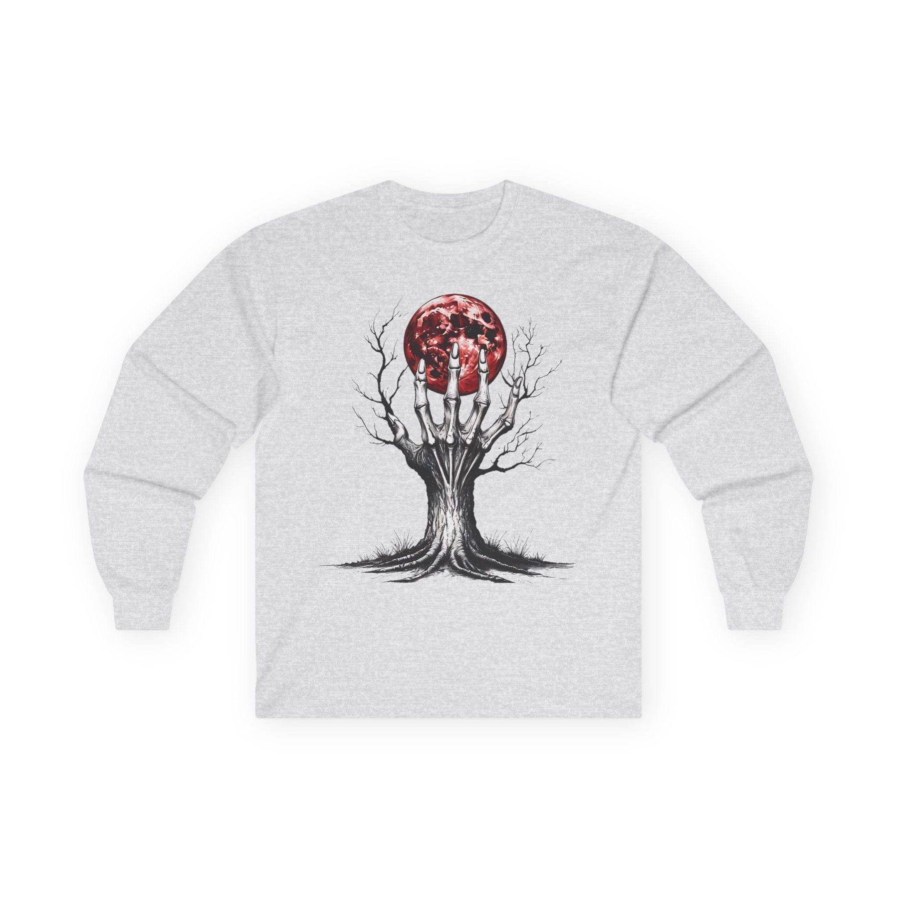 The skeletal tree long sleeve shirt captures attention with its bold graphic. The unique print blends skeletal branches with a striking red moon. This design stands out. Only high-quality fabric touches your skin. The material feels soft yet durable. The fit is comfortable for daily wear. The cuffs are fitted. Movement stays unrestricted. The neckline holds its shape after many washes.