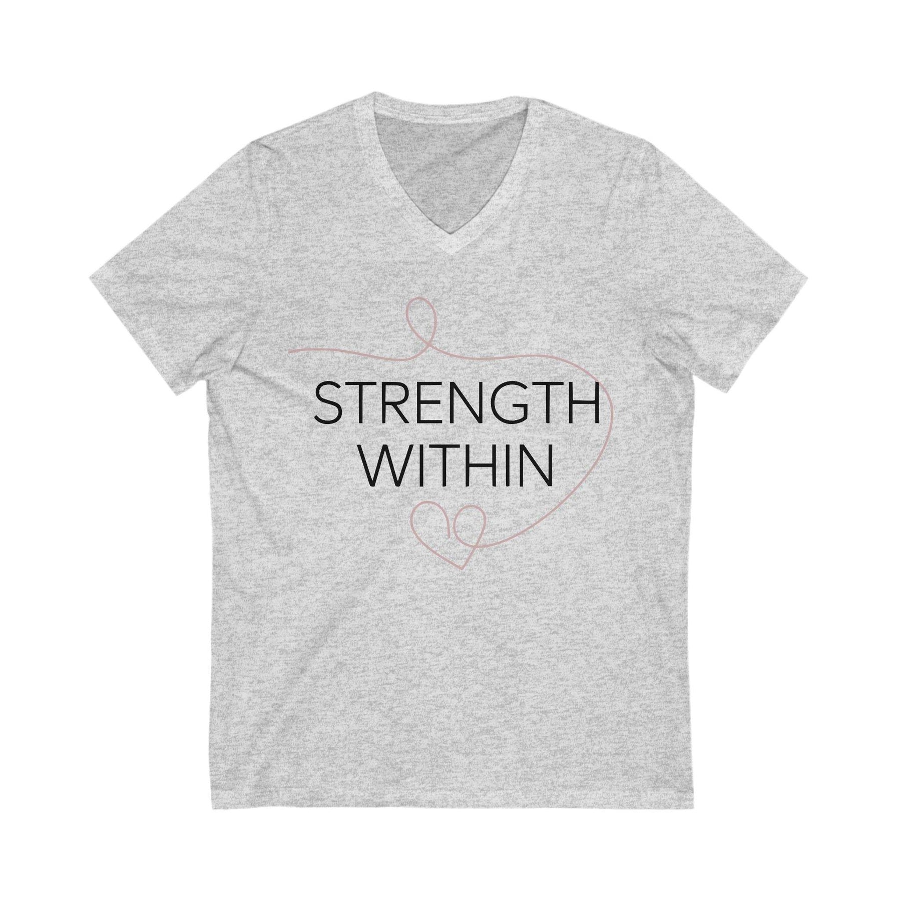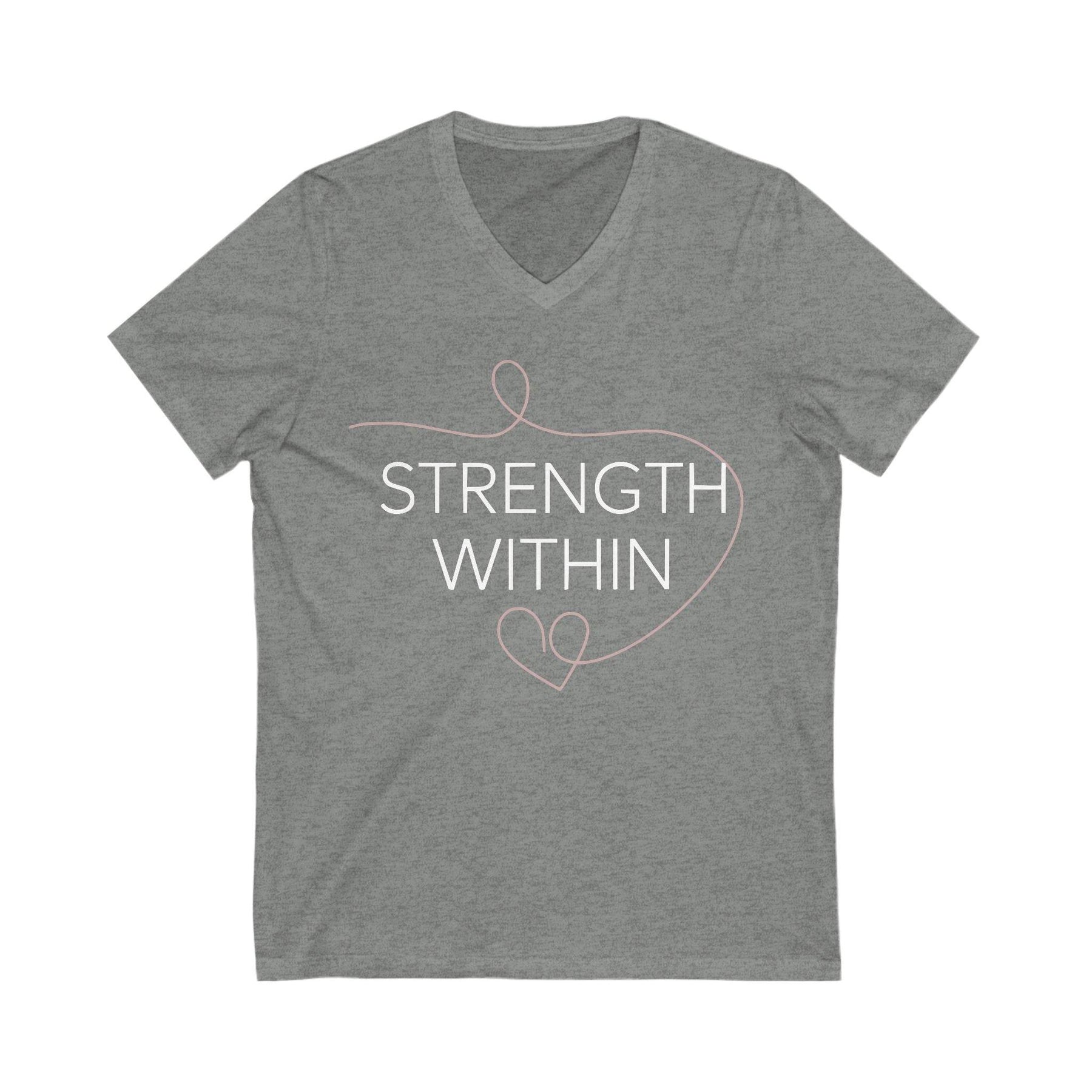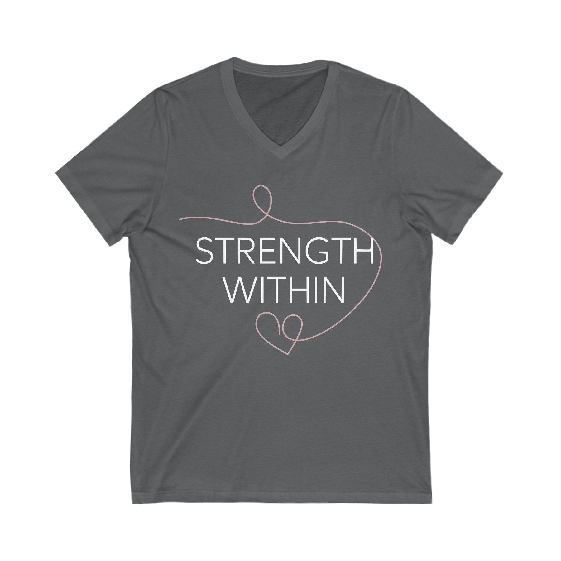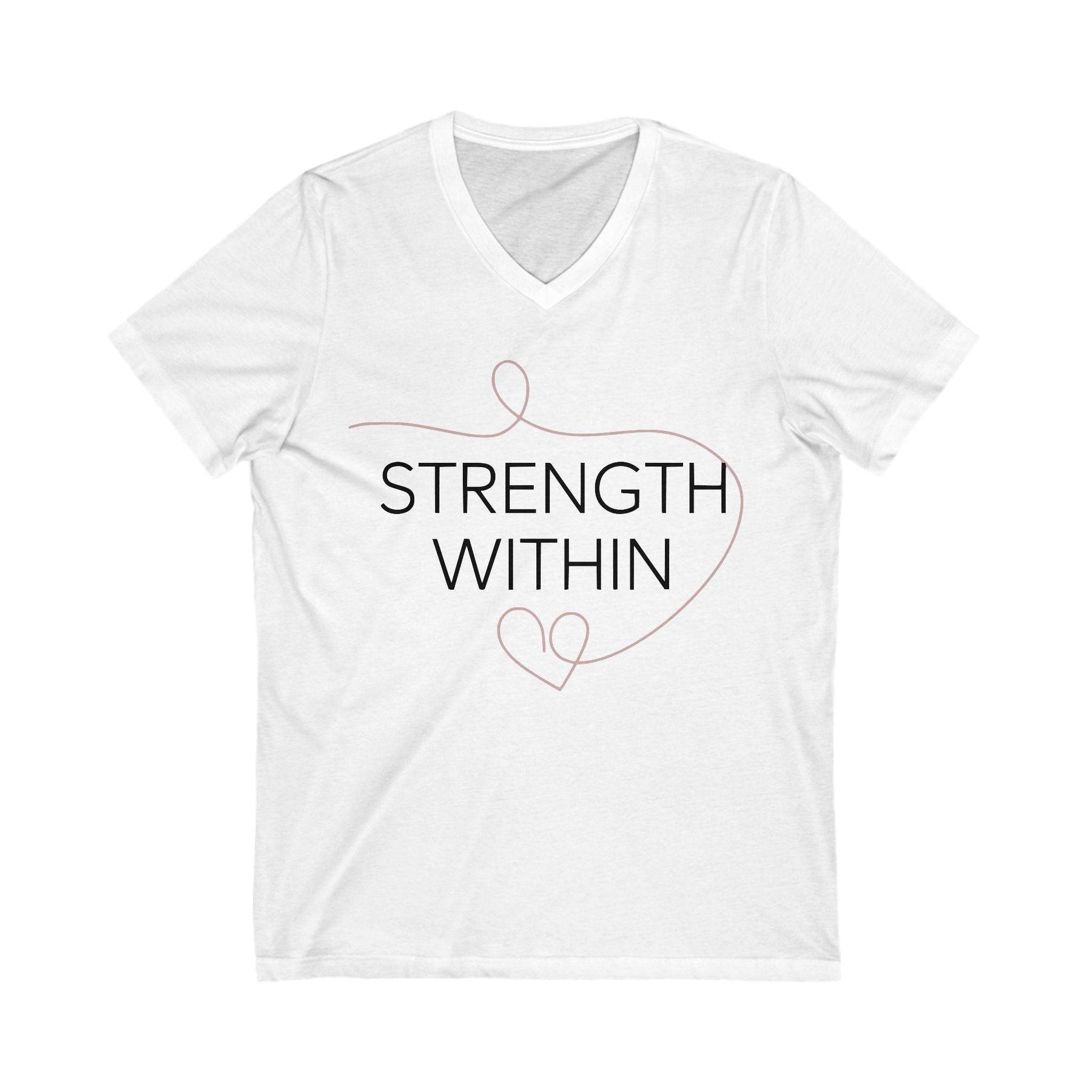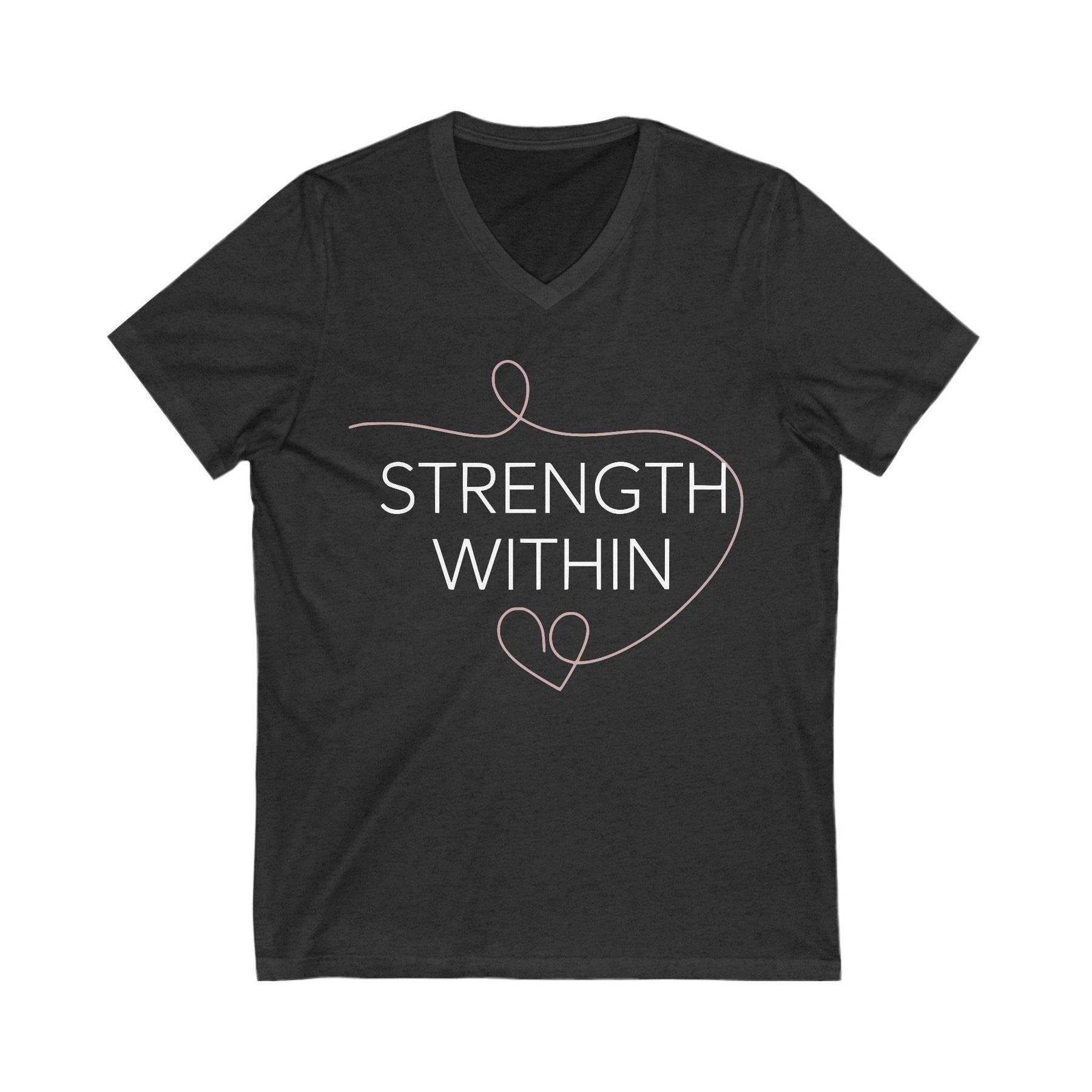 The Inner Strength Motivational V-Neck Tee from Gutsy Garb brings bold style and empowerment to your everyday look. This inner strength graphic tee features a minimalist yet eye-catching design. The "Strength Within" message appears across the chest with subtle line art detailing. It captures attention and inspires confidence every time you wear it.