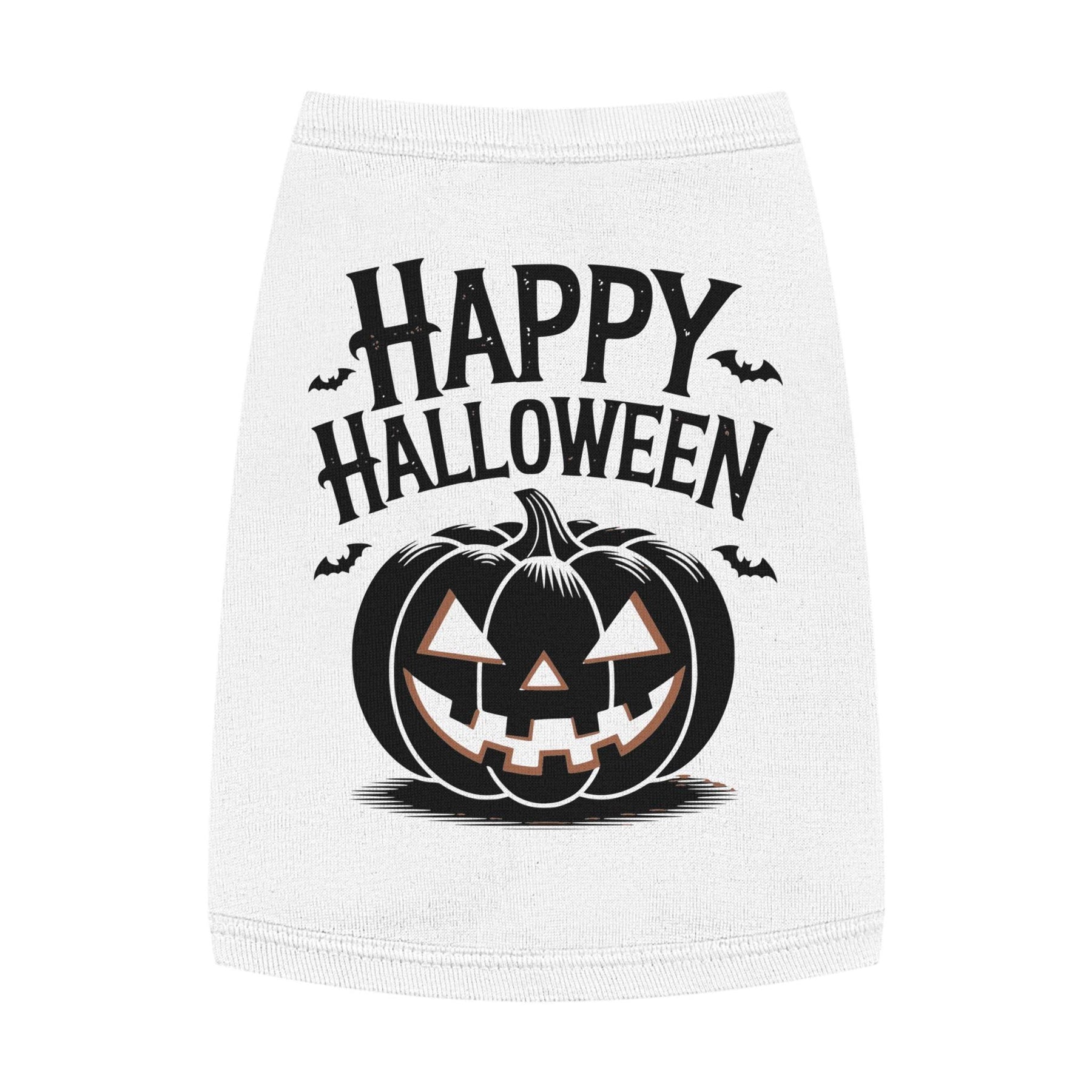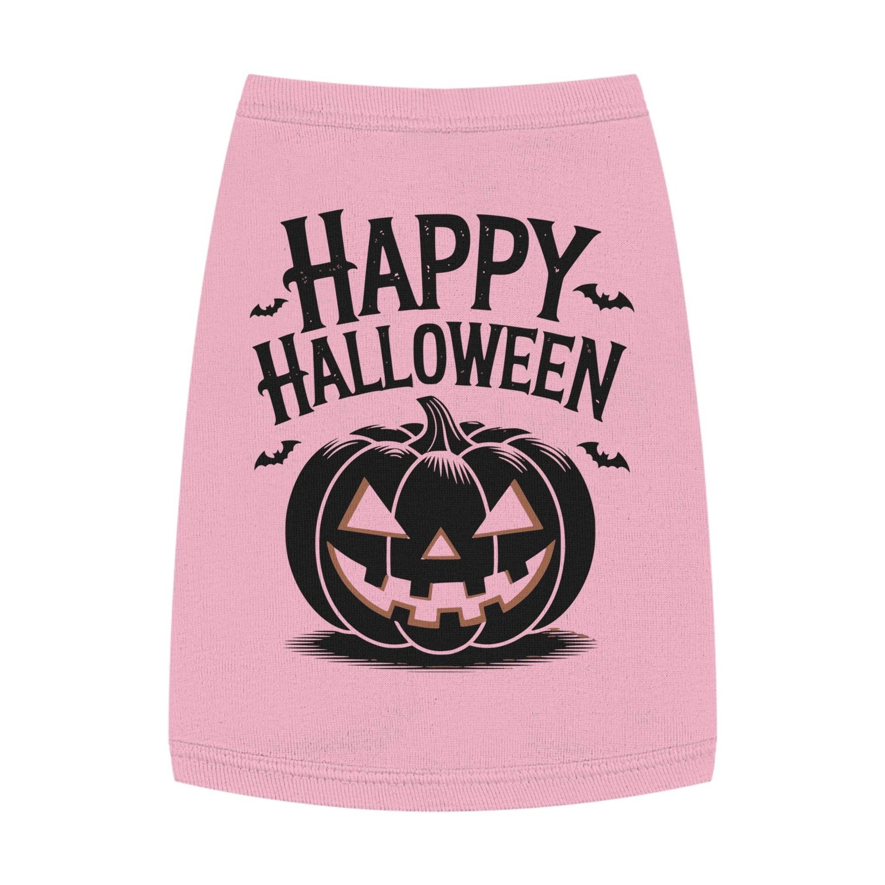 Let your pup steal the show with this cute Halloween outfit for dogs from Gutsy Garb. This Halloween Pet Tank Top features a bold pumpkin design with classic 'Happy Halloween' text. The bright, graphic print stands out against the soft gray fabric. Your dog gets instant festive style for the season.