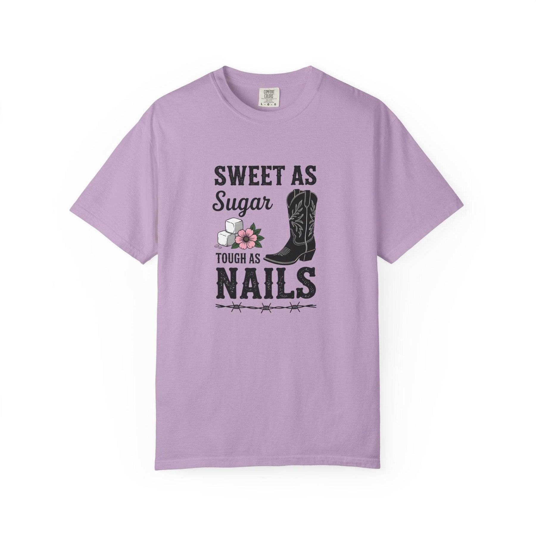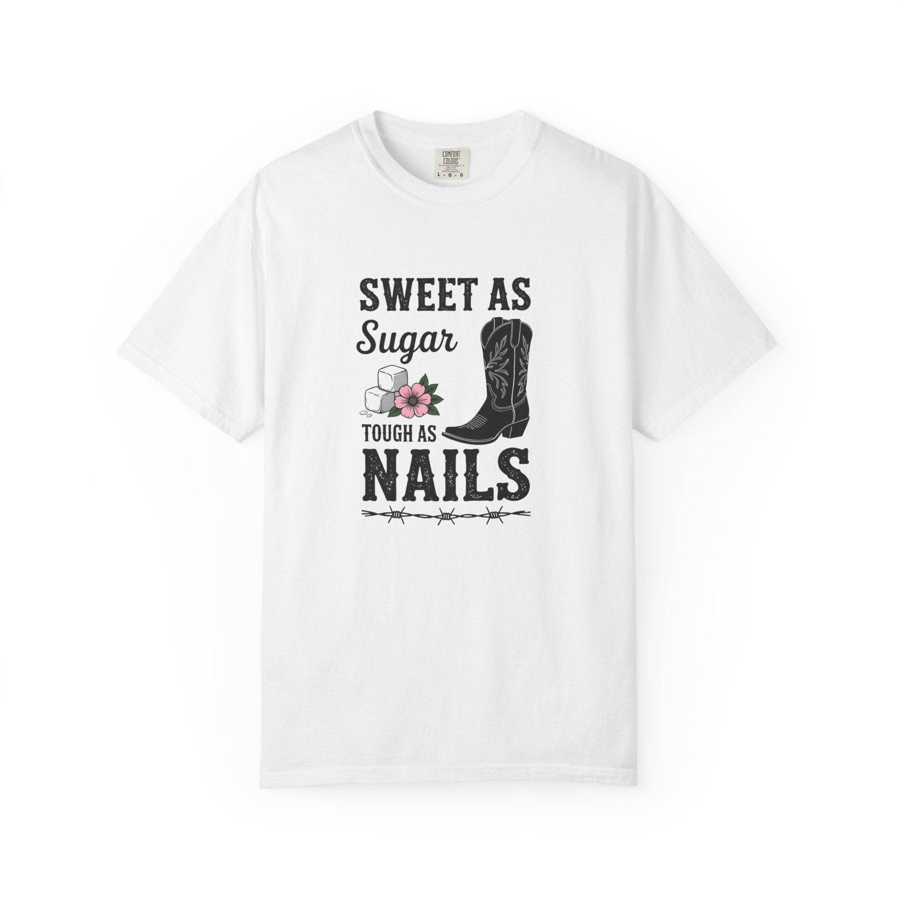 The Southern Sweetness Tee captures the spirit of bold style. It uses strong cotton fabric. This shirt features the catchphrase "sweet as sugar tough as nails shirt" printed on the front. The design has a cowboy boot, soft flower, and barbed wire accent. The top shows you are gentle yet full of grit.